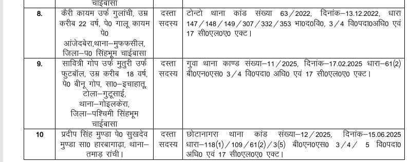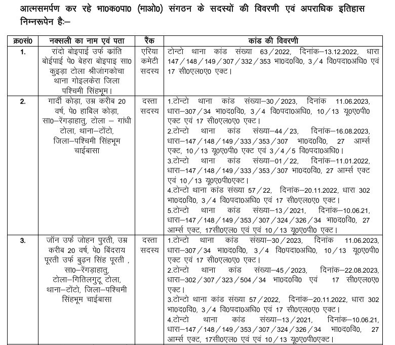 गुरुवार को झारखंड सरकार के प्रत्यार्पण एवं पुनर्वास नीति से प्रभावित होकर झारखंड के डीजीपी अनुराग गुप्ता, सीआरपीएफ झारखंड जगुआर के वरीय पदाधिकारियों के सामने भाकपा माओवादी संगठन के 10 सदस्यों ने आत्मसर्पण किया। आत्मसर्पण करने वाले सदस्यों में एरिया कमांडर रांदो बोइपाई उर्फ क्रांति बोईपाई समेत दस्ता के 10 सदस्यों ने सरेंडर किया है। पश्चिम सिहंभूम जिले में 2022 से अब तक कुल 9631 अभियान संचालित किये गये है, जिसके फलस्वरूप पिछले तीन वर्षो में कुल 175 नक्सलियों को गिरफ्तरी किया गया और 10 नक्सली मुठभेड़ में मारे गये है।