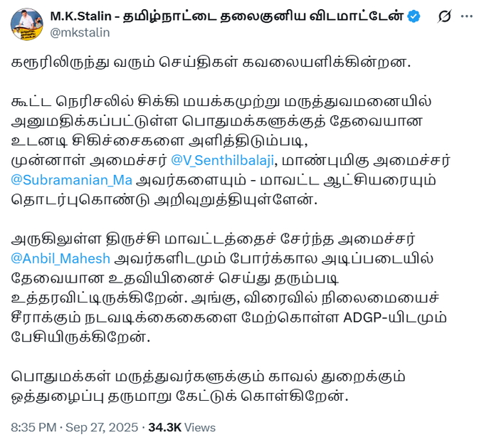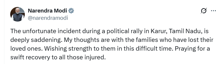 जानकारी के मुताबिक अभिनेता से नेता बने विजय की पार्टी तमिलगा वेट्री कजगम यानी TVK की रैली में बड़ी संख्या में लोग पहुंचे थे। विजय के भाषण के दौरान भीड़ बढ़ने से भगदड़ जैसे हालात बन गए,और राजनीतिक रैली में दमघुटने से कई लोगों की मौत हो गई और कई बेहोश हो गए। इस दुखद घटना के बाद प्रधानमंत्री नरेंद्र मोदी ने एक्स पर पोस्ट करते हुए लिखा कि “तमिलनाडु के करूर में एक राजनीतिक रैली के दौरान हुई दुर्भाग्यपूर्ण घटना बेहद दुखद है। मेरी संवेदनाएं उन परिवारों के साथ हैं जिन्होंने अपने प्रियजनों को खो दिया है। मैं इस कठिन समय में उन्हें शक्ति प्रदान करने की कामना करता हूं। सभी घायलों के शीघ्र स्वस्थ होने की प्रार्थना करता हूं।”