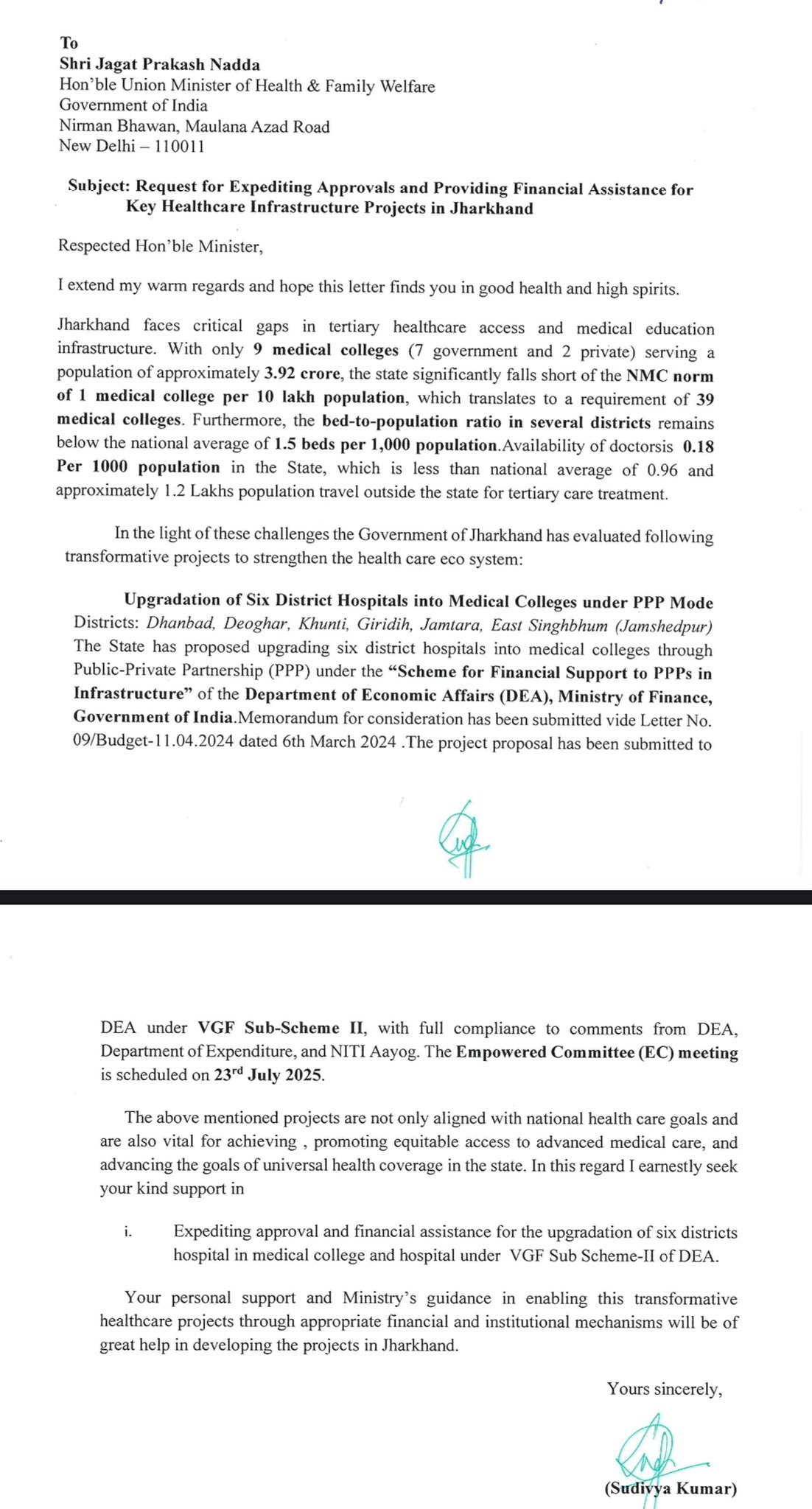 झारखण्ड की जनता हेतु पीपीपी मोड पर 6 मेडिकल कॉलेजों की स्थापना की दिशा में आपके सकारात्मक सहयोग और पहल के लिए मैं हृदय से आपका आभार व्यक्त करता हूँ।