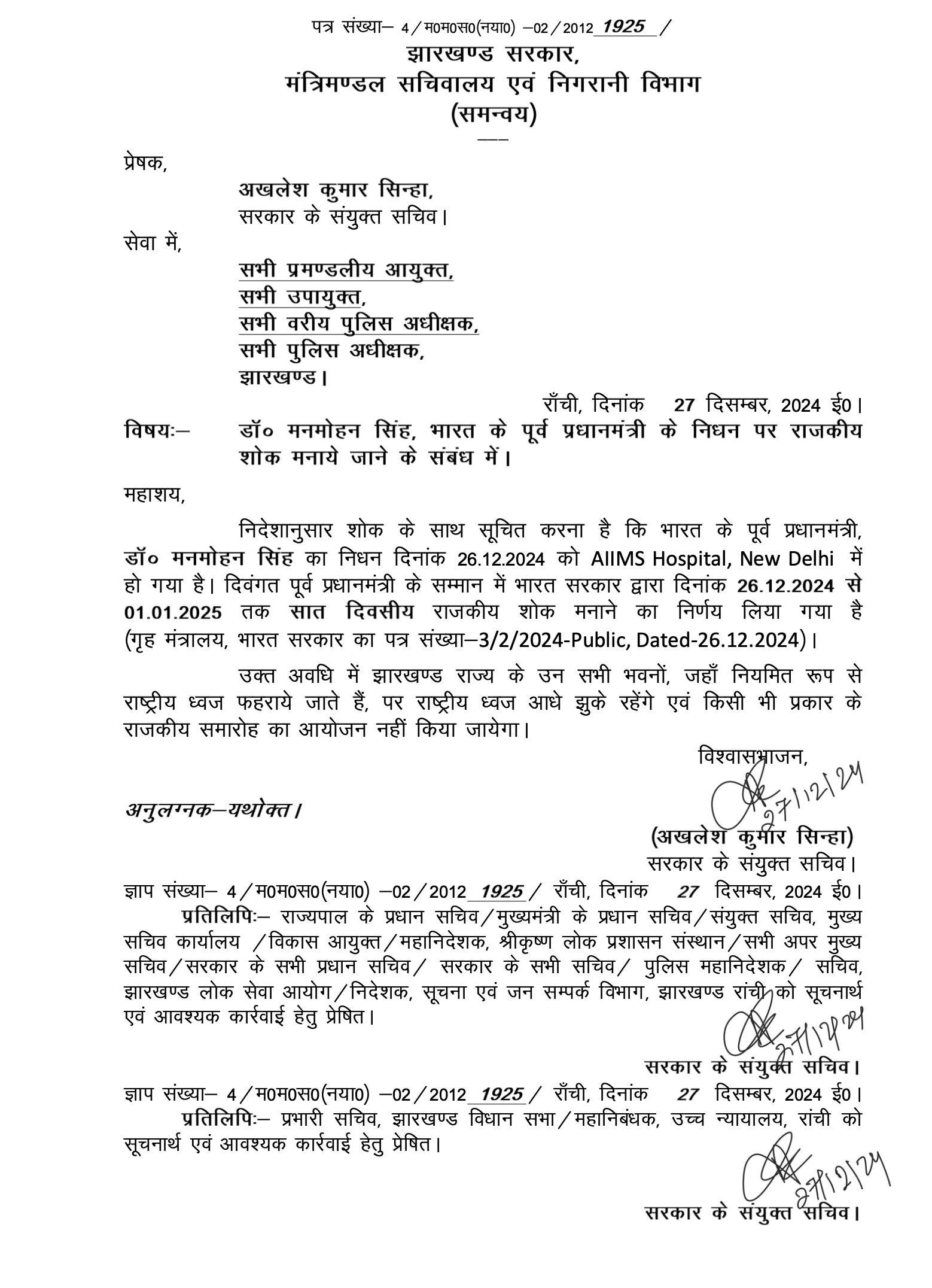 रांचीः झारखंड में सात दिनों के राजकीय शोक की घोषण की गई है ।  पूर्व प्रधानमंत्री डॉ० मनमोहन सिंह का निधन  दिल्ली के  AIIMS में हुआ है । सरकार के द्वारा प्रेस विज्ञप्ति के मुताबिक पूर्व प्रधानमंत्री के सम्मान में भारत सरकार द्वारा दिनांक 26.12.2024 से 01.01.2025 तक सात दिवसीय राजकीय शोक मनाने का निर्णय लिया गया है।