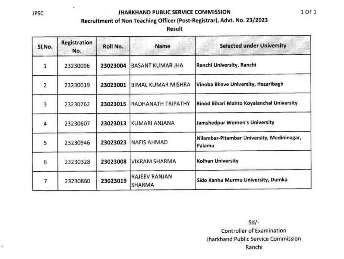 रांचीः झारखंड लोक सेवा आयोग जेपीएससी ने गुरूवार को राज्य के 7 विश्वविद्यालयों में रजिस्ट्रार पद पर नियुक्ति के लिए रिजल्ट जारी कर दिया। रांची यूनिवर्सिटी में बसंत कुमार झा को रजिस्ट्रार बनाया गया है। बिमल कुमार मिश्र विनोबा भावे यूनिवर्सिटी हजारीबाग के रजिस्ट्रार बने है।