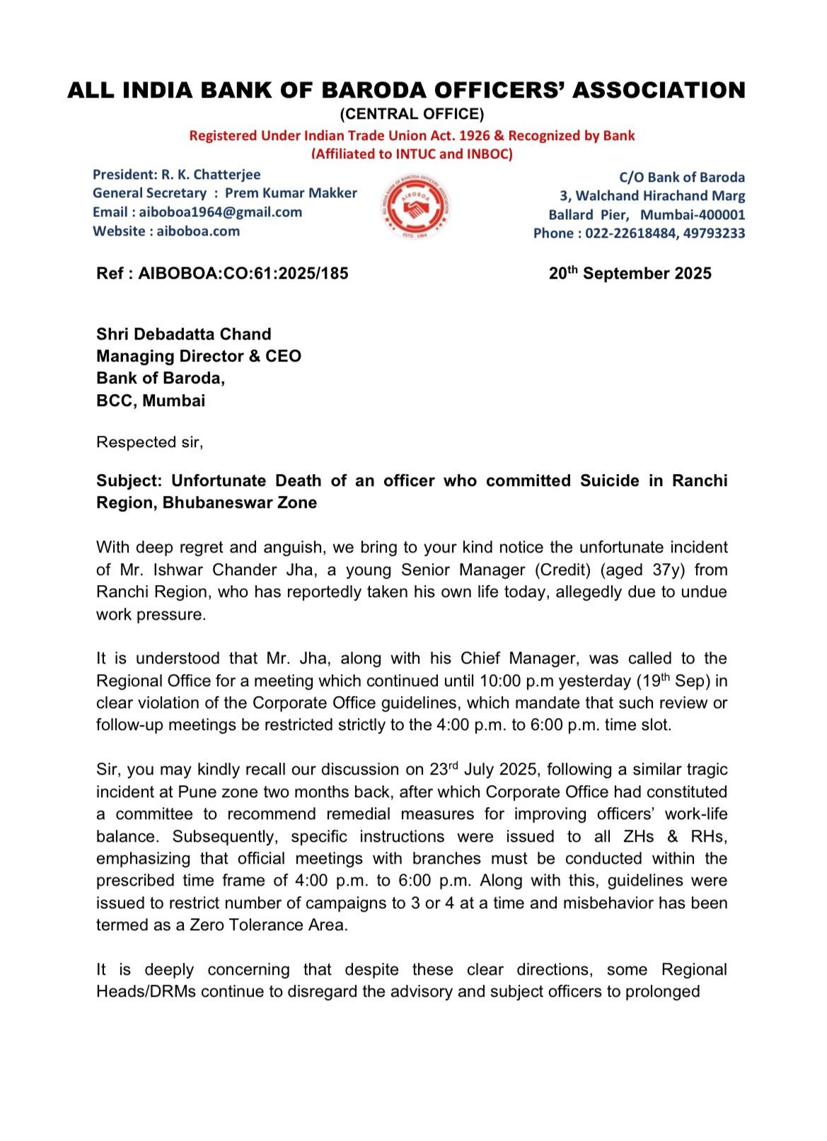 ईश्वर चंद्र झा के आत्महत्या पर एसोसिएशन ने बैंक के MD और CEO को पत्र लिखकर बताया कि कल चीफ मैनेजर ने रात दस बजे तक रीजनल ऑफिस में मीटिंग की थी। यह कॉर्पोरेट ऑफिस गाइड लाइन का उल्लंघन है।
