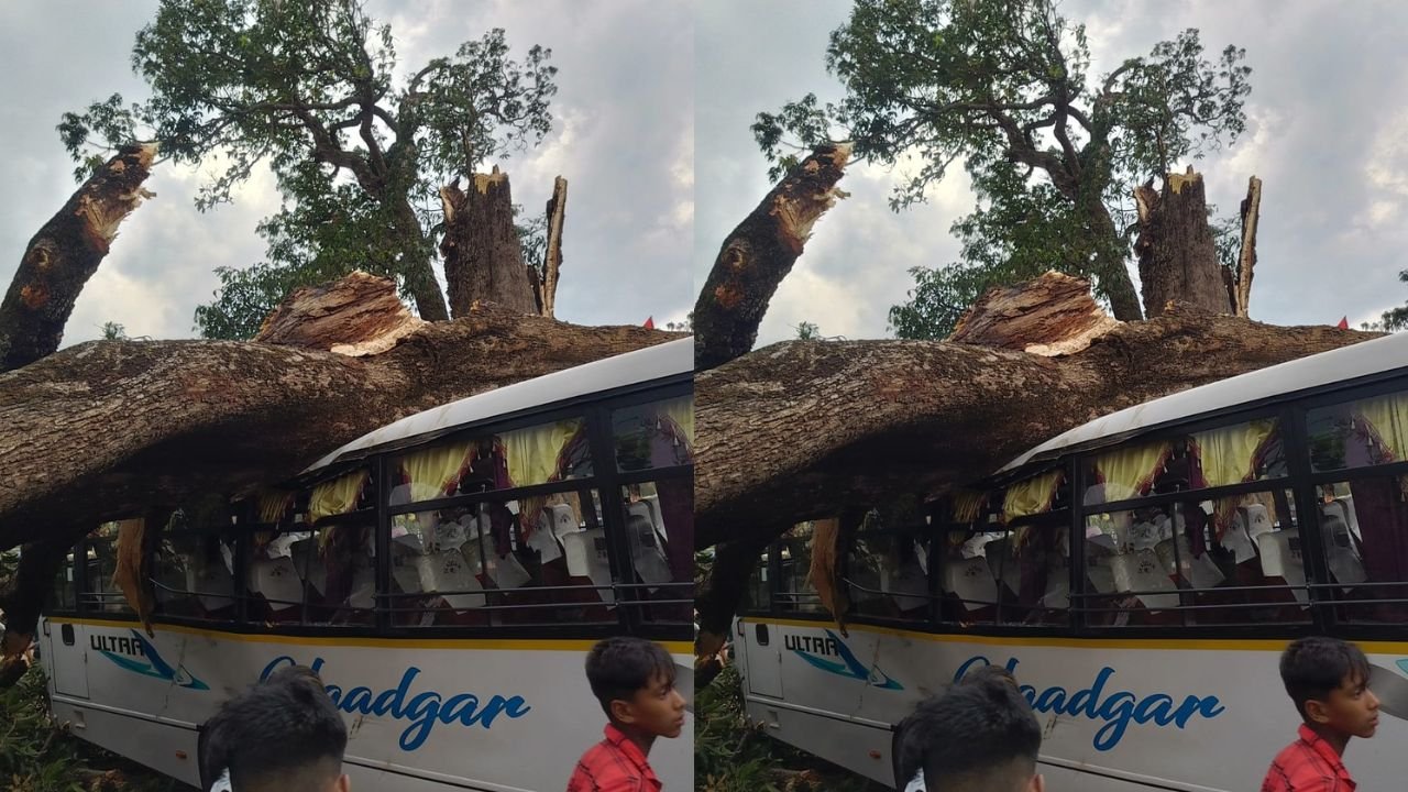 सभी बाराती बस से उतरकर शादी समारोह में शामिल होने के लिए सरवर अंसारी के घर गए हुए थे। बस का ड्राइवर यात्री बस को नदिया उच्च विद्यालय के गेट के समीप मैदान में खड़ा कर दिया था। इसी बीच रविवार शाम मौसम का मिजाज बदल गया और तेज हवा और बारिश शुरू हो गई। बाराती वापस जाने के लिए सभी बस में सवार हो ही रहे थे कि एक आम का विशालकाय पेड़ बस के ऊपर गिर गया। जिससे बस की छत बुरी तरह से क्षतिग्रस्त हो गई। यह देखकर लोग हैरान रह गए। यदि कुछ मिनट की देरी से पेड़ बस में गिरा होता तो बड़ा हादसा हो सकता था। घटना को लेकर लोग हैरान हैं। घटना के बाद स्थानीय ग्रामीणों द्वारा पेड़ को हटाने का प्रयास किया जा रहा है।