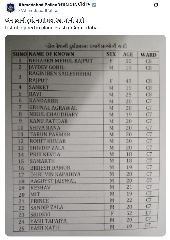 इससे पहले अहमदाबाद के पुलिस कमिश्नर ने कहा था कि अहमदाबाद से लंदन जा रही एयर इंडिया के विमान क्रैश होने के बाद किसी भी यात्री के जिंदा बचने की संभावना नहीं है। अहमदाबाद के पुलिस कमिश्नर जेएस मलिक ने विमान हादसे को लेकर बड़ा बयान सामने आया है। हालांकि अभी तक मौत का आधिकारिक आकड़ा सामने नहीं आया है।उन्होंने बताया कि कुछ घायलों को इलाज के लिए अस्पताल लाया गया था, लेकिन उनकी हालत अत्यंत गंभीर थी और उन्हें बचा पाना कठिन साबित हो रहा है। कमिश्नर मलिक ने बताया कि रेस्क्यू ऑपरेशन जारी है, लेकिन मलबे और आग की स्थिति को देखते हुए हालात बेहद चुनौतीपूर्ण बने हुए हैं।पुलिस कमिश्नर ने आगे जानकारी दी की विमान हादसे में 204 लोगों की मौत हो गई है, 41 लोगों का अभी इलाज चल रहा है। अहमदाबाद पुलिस ने अहमदाबाद में विमान दुर्घटना में घायल हुए 25 लोगों की सूची जारी की है।गुजरात स्वास्थ्य विभाग के अतिरिक्त मुख्य सचिव ने कहा, “अहमदाबाद सिविल अस्पताल के छात्र छात्रावास, स्टाफ क्वार्टर और अन्य आवासीय क्षेत्र उस क्षेत्र में स्थित हैं जहां विमान दुर्घटनाग्रस्त हुआ। घायलों में से लगभग 50 को अहमदाबाद के सिविल अस्पताल में लाया गया है।”