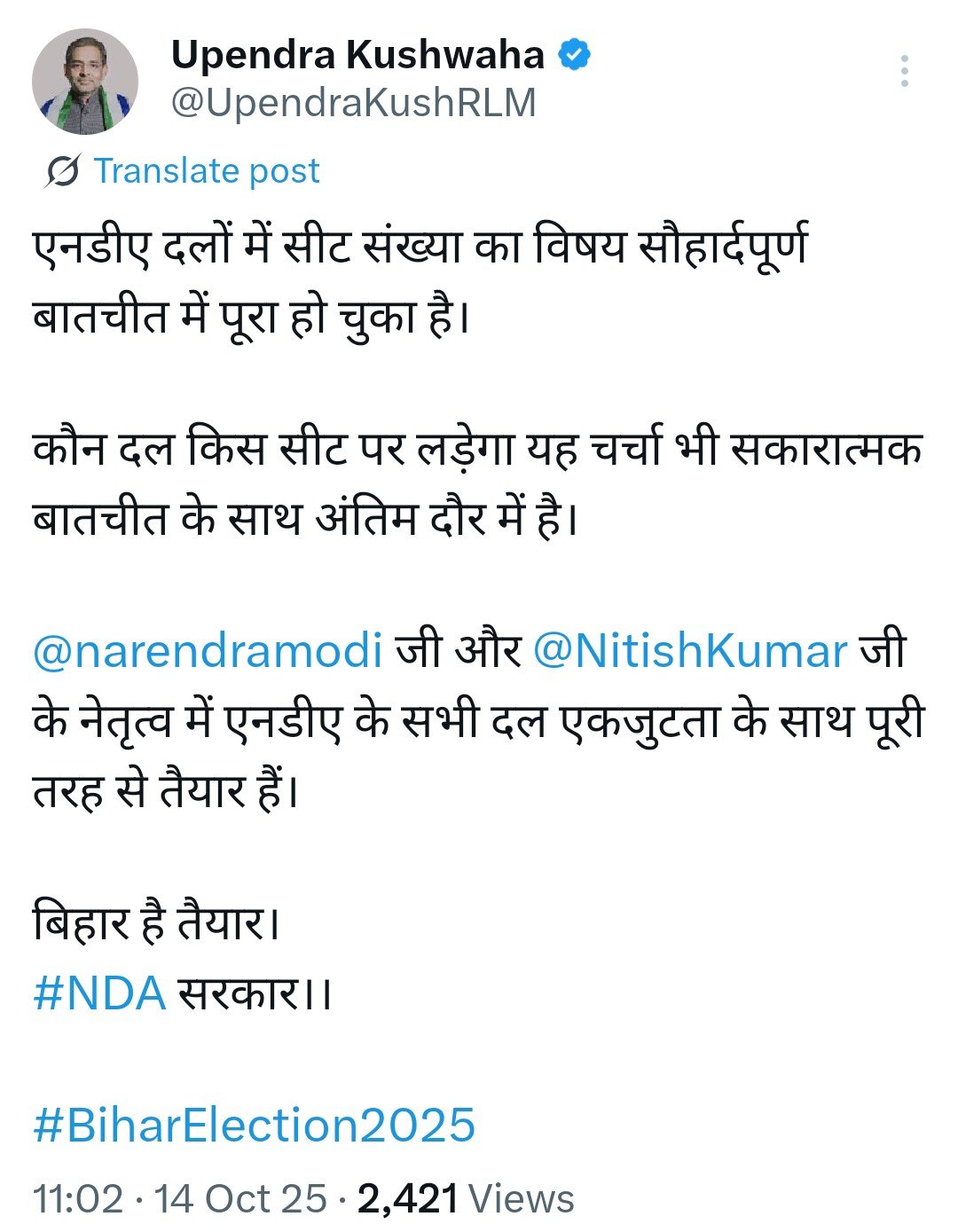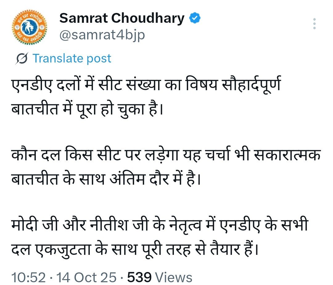 एनडीए में मचे घमासान के बीच उपमुख्यमंत्री सम्राट चौधरी, केंद्रीय मंत्री चिराग पासवान और पूर्व केंद्रीय मंत्री उपेंद्र कुशवाहा ने सोशल मीडिया पर एक पोस्ट लिखा है। इस पोस्ट में सभी की ओर से एक ही लेख को पोस्ट किया गया है बिल्कुल वैसे ही जैसे सीट शेयरिंग के दौरान एक ही लेख को सभी नेताओं ने पोस्ट किया था। नाराजगी की खबरों को खारिज करते हुए एनडीए के नेताओं ने एक बार फिर एक ही लेख को पोस्ट किया है, जिसको लेकर सोशल मीडिया पर लोग तरह-तरह की प्रतिक्रिया दे रहे है। कुछ लोग कह रहे है कि क्या सभी नेताओं के भावनाओं को लिखने वाले एक ही शख्स है, क्या कहीं और से लिखा हुआ लेख आता है जिसे सभी शेयर करते है।