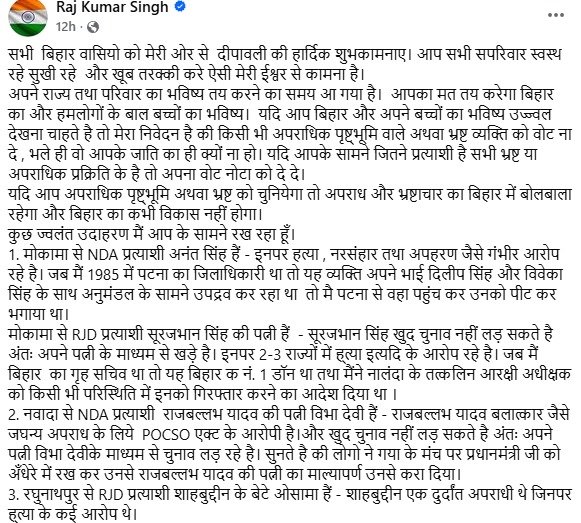 आरके सिंह ने अपने सोशल मीडिया अकाउंट पर पोस्ट करते हुए लिखा है कि सभी बिहार वासियो को मेरी ओर से दीपावली की हार्दिक शुभकामनाए। आप सभी सपरिवार स्वस्थ रहे सुखी रहे और खूब तरक्की करे ऐसी मेरी ईश्वर से कामना है।