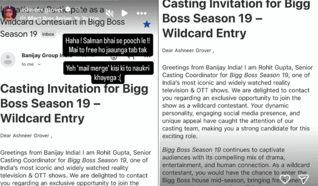 अश्नीर ग्रोवर ने सोशल मीडिया पर एक स्क्रीन शॉट शेयर करते हुए बिग बॉस-19 में वाइल्ड कार्ड एंट्री के लिए आये ऑफर को शेयर किया है। इसमें लिखा गया है कि ये ऑफर बिग बॉस के सीनियर कॉस्टिंग कोऑडिनेटर ने भेजा है। अश्नीर ग्रोवर इससे पहले बिग बॉस-18 में शामिल हुए थे। इसमें वो एपिसोड में सलमान खान के पास पहुंचे तो सलमान ने उन्हें उनके कुछ बयानों को लेकर ग्रिल किया था। अब अश्नीर ने दावा किया है कि बिग बॉस-19 में उन्हें वाइल्ड कार्ड एंट्री का ऑफर दिया है।