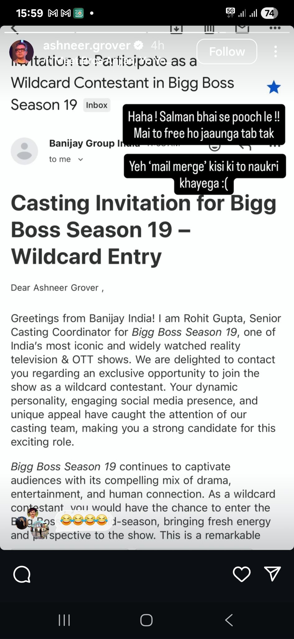 अश्नीर ग्रोवर ने मेल का स्क्रीनशॉट शेयर करने के साथ सलमान खान पर तंज कसते हुए लिखा कि- सलमान भाई से पूछ ले। मैं तो फ्री हो जाउंगा तबतक। फिर उन्होंने लिखा- ये मेल मर्ज किसी की तो नौकरी खाएगा।