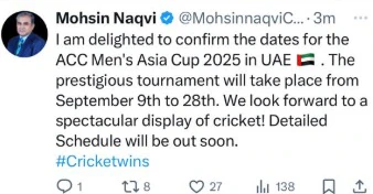एशियन क्रिकेट काउंसिल के अध्यक्ष और पाकिस्तान क्रिकेट बोर्ड के चेयरमैन मोहसिन नकवी ने शनिवार 26 जुलाई को एक सोशल मीडिया पोस्ट में टूर्नामेंट की तारीखों का खुलासा किया। नकवी ने लिखा कि टूर्नामेंट का आयोजन UAE में किया जाएगा और ये 9 सितंबर से शुरू होगा और 28 सितंबर को इसका फाइनल खेला जाएगा। हालांकि, उन्होंने टूर्नामेंट के पूरे कार्यक्रम का खुलासा नहीं किया लेकिन ये बताया कि शेड्यूल जल्द ही सामने आएगा।