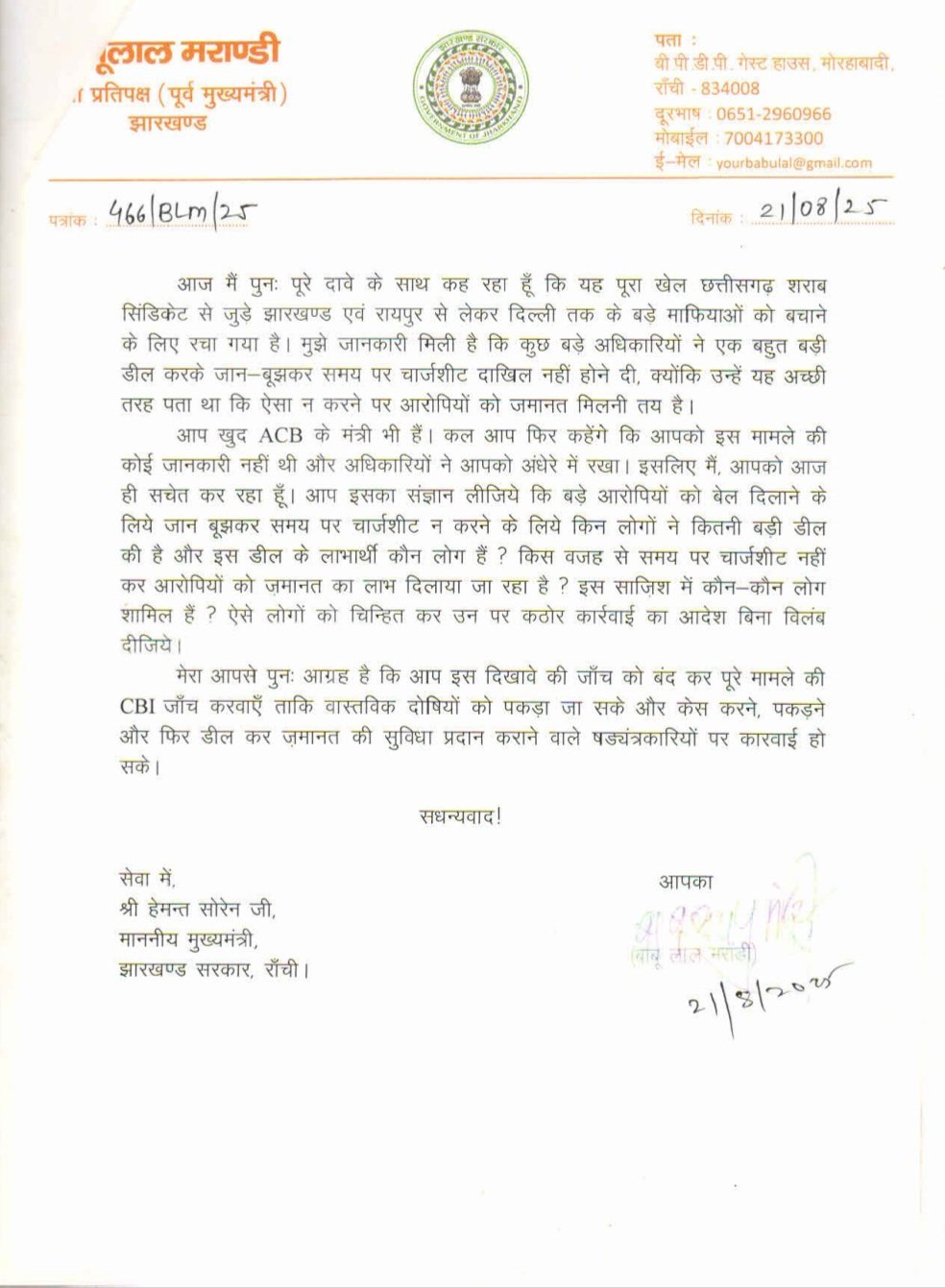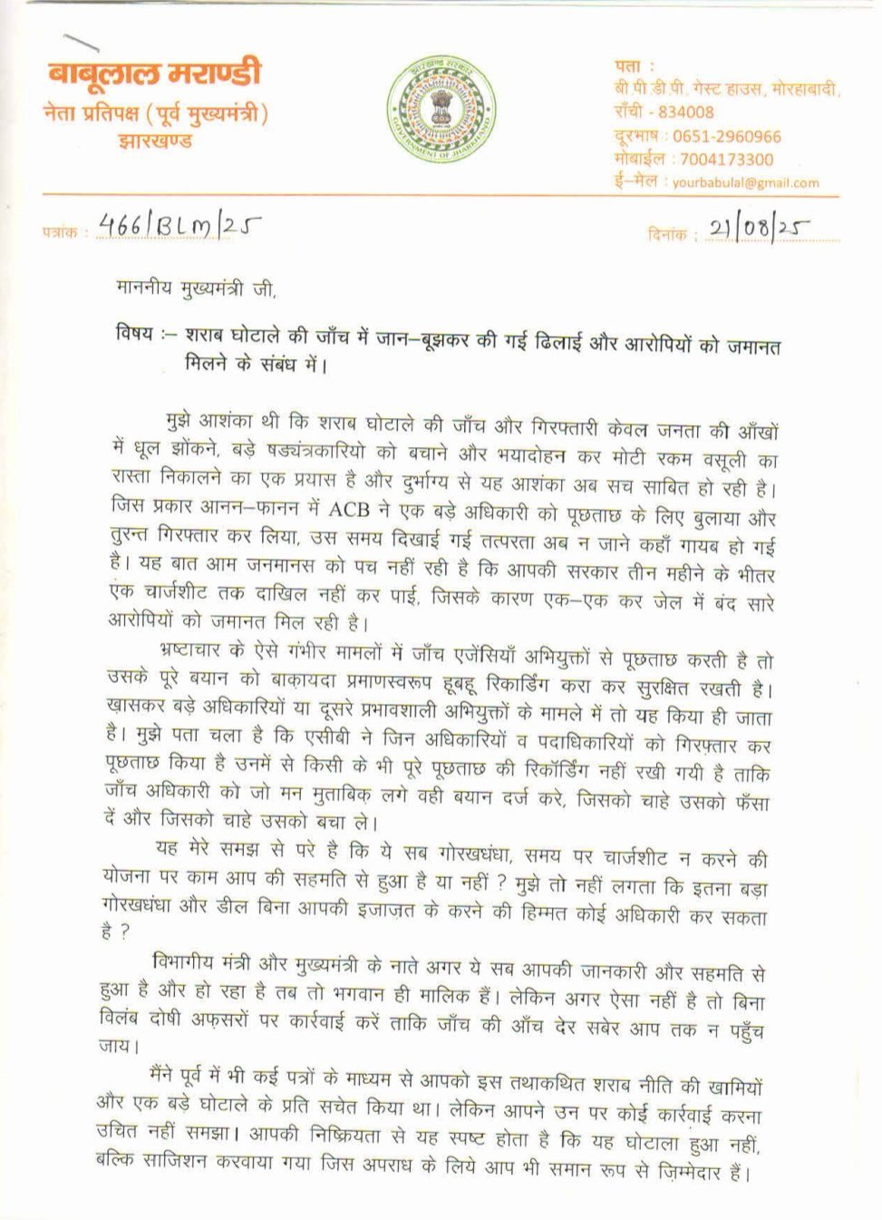 इससे पहले मरांडी ने अपने सोशल मीडिया अकाउंट एक्स पर शराब घोटाले को लेकर पोस्ट करते हुए लिखा था कि माननीय मुख्यमंत्री @HemantSorenJMM महोदय। शराब घोटाले की जांच और गिरफ्तारी आंख में धूल झोंकने का प्रयास था, ये आशंका धीरे-धीरे सही साबित हो रही है।शराब नीति की खामियों और संभावित घोटालों के प्रति सचेत करने के लिए आपको पहले भी कई पत्र प्रेषित की गई थी। आपने कोई कारवाई नहीं की। इससे स्पष्ट है कि घोटाला हुआ नहीं बल्कि साजिशन करवाया गया।पहले प्रेषित पत्र और आग्रहों को अपने अनसुना कर दिया। मैं जानता हूं कि आप मेरे आग्रह को फिर से अनसुना कर देंगे बावजूद इसके मैं पुनः सूचित कर रहा हु कि कुछ बड़े अधिकारियों ने बड़ा डील कर जानबूझ कर चार्जशीट समय पर दाखिल नहीं किया। उन्हें मालूम था कि चार्जशीट दायर नहीं होने पर जमानत मिल जायेगी।मिल रही जानकारी के अनुसार छत्तीसगढ़ सिंडिकेट से जुड़े बड़े माफियाओं को जेल से बाहर निकालने के लिए पूरा खेल किया गया। ये डील भी बहुत बड़ा है। कहीं बाद में आपको इस बड़े डील की जांच न करानी पड़ जाए।