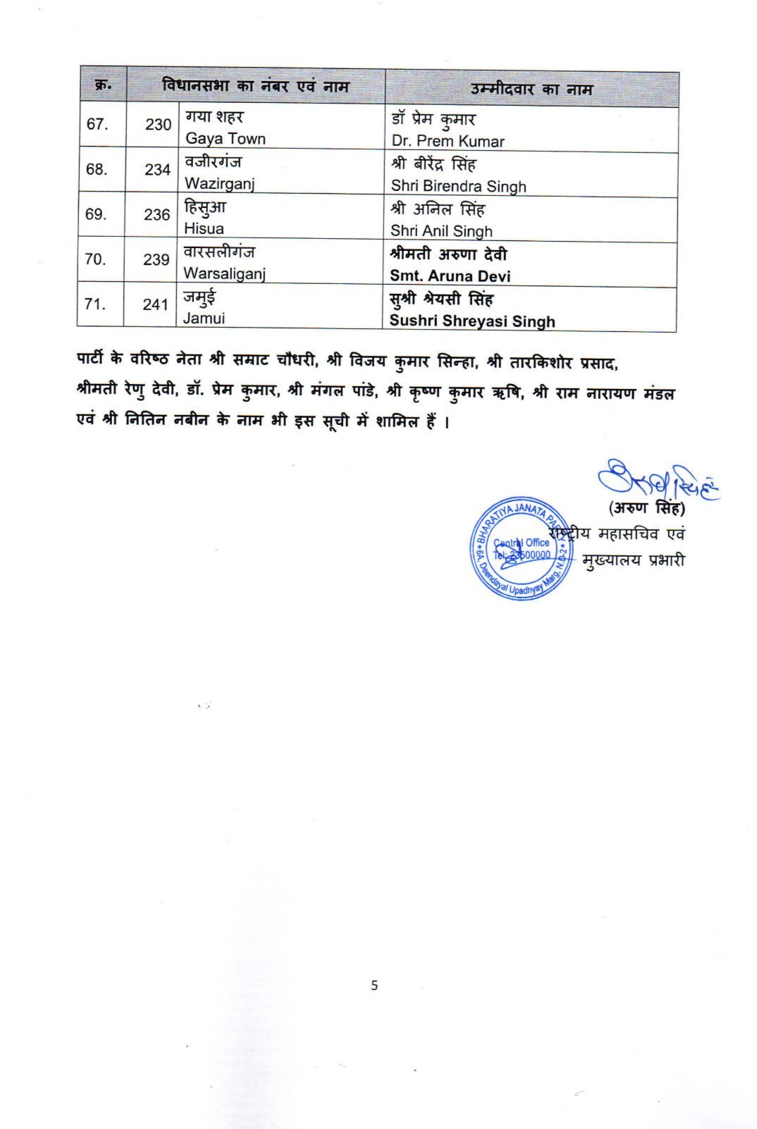 वहीं, पशुपालन एवं मत्स्य संसाधन मंत्री रेनू देवी को बेतिया सीट से उम्मीदवार बनाया गया है।