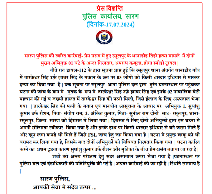 सारण के धानाडीह गांव में कल रात अपराधियों ने एक व्यक्ति और उसकी दो नाबालिग बेटियों की हत्या कर दी। व्यक्ति की पत्नी को घायल अवस्था में अस्पताल भेजा गया। पुलिस ने दो आरोपियों सुधांशु कुमार और अंकित कुमार को गिरफ्तार कर लिया है। हत्या में इस्तेमाल हथियार बरामद कर लिया गया है। प्रथम दृष्टया घटना का कारण मृतका और सुधांशु कुमार के बीच प्रेम संबंध लग रहा है। शवों को पोस्टमार्टम के लिए भेज दिया गया है। आगे की कार्रवाई की जा रही है।