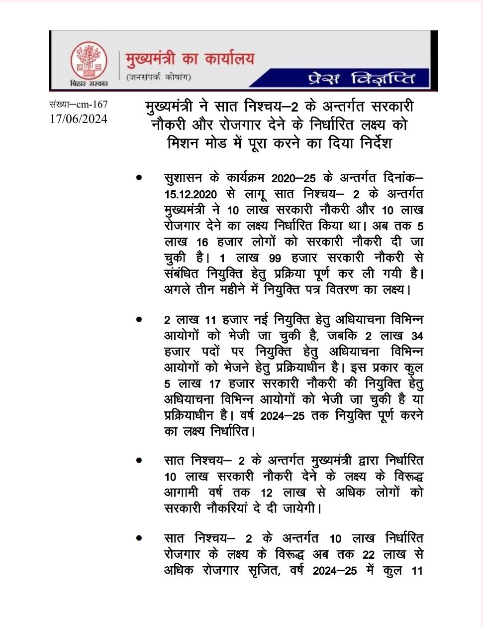 पटना: बिहार के मुख्यमंत्री नीतीश कुमार सात निश्चय-2 के अंतर्गत सरकारी नौकरी और रोजगार देने के लक्ष्य को बढ़ाने का फैसला किया है। बिहार सरकार ने पहले 10 लाख सरकारी नौकरी देने का लक्ष्य रखा था, उसे अब बढ़ाकर 12 लाख करने का निर्देश मुख्यमंत्री नीतीश कुमार ने दिया है। मुख्यमंत्री ने इसको लेकर मिशन मोड़ में काम करने निर्देश भी दिया है।