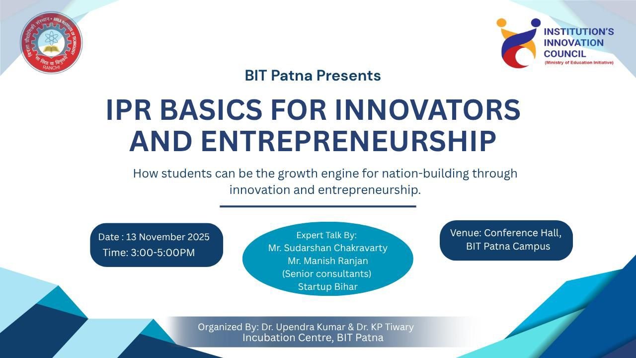 इन्क्यूबेशन सेंटर, बी.आई.टी. पटना द्वारा “आई.पी.आर. बेसिक्स फॉर इनोवेटर्स एंड एंटरप्रेन्योरशिप” विषय पर एक प्रेरणादायक एवं ज्ञानवर्धक सत्र का सफल आयोजन *13 नवम्बर 2025* को संस्थान के कॉन्फ्रेंस हॉल में किया गया। इस सत्र का मुख्य उद्देश्य छात्रों में नवाचार, उद्यमिता तथा बौद्धिक संपदा अधिकारों (Intellectual Property Rights – IPR) के महत्व को समझाना तथा उन्हें राष्ट्र निर्माण के विकास इंजन के रूप में तैयार करना था।