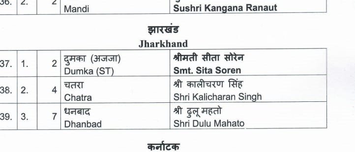 वही धनबाद से पीएन सिंह की जगह बाघमारा विधायक ढुल्लू महतो को इस बार टिकट दिया है। सुनील सिंह की जगह चतरा से कालीचरण सिंह को टिकट दिया गया है। पिछले दिनों राजनाथ सिंह के कार्यक्रम के दौरान सुनील सिंह का जमकर विरोध हुआ था। बीजेपी ने हेमंत सोरेन की भाभी सीता सोरेन को दुमका से चुनावी मैदान में उतारकर बड़ा दांव चला है। वही पिछली लिस्ट में दुमका से सुनील सोरेन को टिकट देने की घोषणा कर दी गई थी, लेकिन सीता सोरेन के बीजेपी में शामिल होने के बाद उनका टिकट वापस ले लिया गया। माना जा रहा था कि दुमका से हेमंत सोरेन चुनाव लड़ेंगे ऐसे में सीता सोरेन को टिकट देकर बीजेपी ने बड़ी चाल चल दी है।धनबाद से बीजेपी में कई दावेदार थे लेकिन लेकिन ढुल्लू महतो केंद्रीय नेतृत्व की पहली पसंद बने और उनको चुनावी मैदान में उतारा गया है।