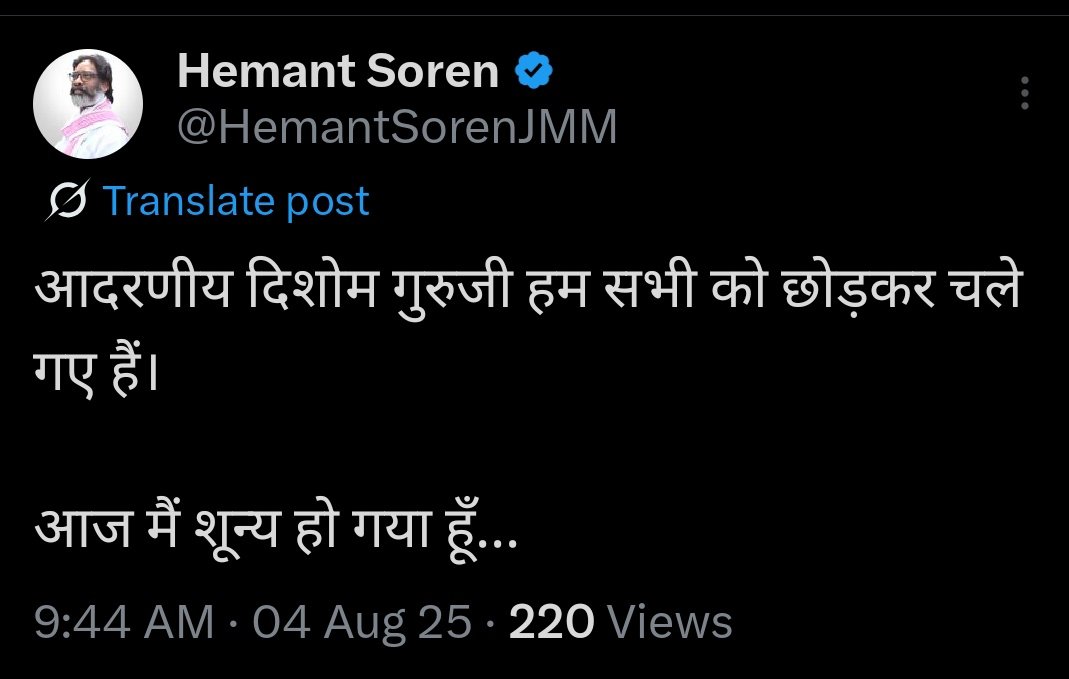 Breaking News: गुरुजी नहीं रहे । दिशोम गुरु..शिबू सोरेन..मरांग बुरु के पास चले गए… उस दुनिया जहां से कोई नहीं लौटता । आदिवासी दुनिया की शेरदिल आवाज़ हमेशा के लिए शांत हो गई । अब हमारे बीच जल-जंगल-जमीन का सबसे बड़ा लड़ाका नहीं रहा । सारंडा के साल जैसे मज़बूत और विशाल वृक्ष जैसे दिशोम गुरु 2025 के मानसून की बारिश में ऐसे बीमार पड़े की डॉक्टर्स उन्हें नहीं बचा पाए । दिल्ली के सर गंगाराम अस्पताल में उन्होंने आखिरी सांस ली । उनके आखिरी क्षणों में मुख्यमंत्री हेमंत सोरेन , बहू कल्पना सोरेन मौजूद रहे । जिस झारखंड के लिए उन्होंने अपना जीवन न्योझावर कर दिया उसकी कमान उनके जाने के वक्त उनके बेटे के हाथ में है । झारखंड के पूर्व मुख्यमंत्री शिबू सोरेन को आज सुबह 8:56 बजे मृत घोषित कर दिया गया। लंबी बीमारी के बाद उनका निधन हो गया। वे किडनी की बीमारी से पीड़ित थे और डेढ़ महीने पहले उन्हें स्ट्रोक भी हुआ था। पिछले एक महीने से वे लाइफ सपोर्ट सिस्टम पर थे।