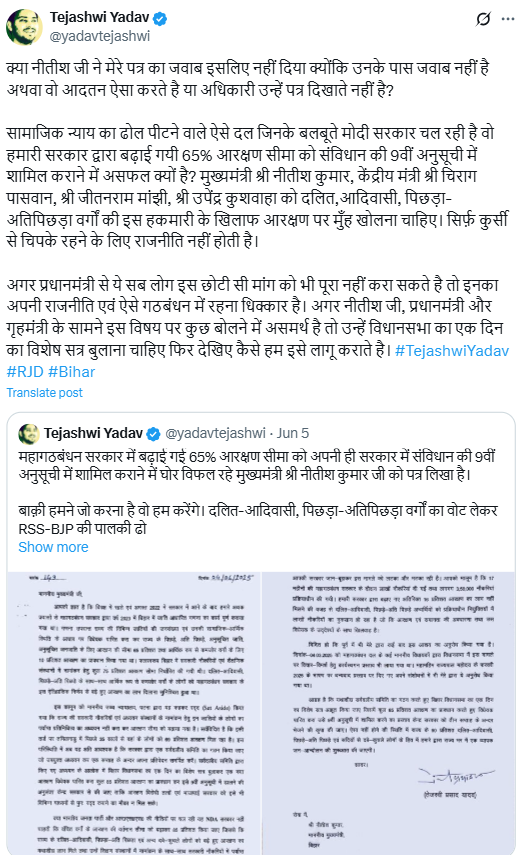 तेजस्वी यादव ने अपने सोशल मीडिया अकाउंट एक्स पर 5 जून को लिखे गए पत्र को टैग करते हुए बिहार के एनडीए गठबंधन की घेराबंदी की है। उन्होने अपने पोस्ट में लिखा है कि क्या नीतीश जी ने मेरे पत्र का जवाब इसलिए नहीं दिया क्योंकि उनके पास जवाब नहीं है अथवा वो आदतन ऐसा करते है या अधिकारी उन्हें पत्र दिखाते नहीं है?सामाजिक न्याय का ढोल पीटने वाले ऐसे दल जिनके बलबूते मोदी सरकार चल रही है वो हमारी सरकार द्वारा बढ़ाई गयी 65% आरक्षण सीमा को संविधान की 9वीं अनुसूची में शामिल कराने में असफल क्यों है? मुख्यमंत्री श्री नीतीश कुमार, केंद्रीय मंत्री श्री चिराग पासवान, श्री जीतनराम मांझी, श्री उपेंद्र कुशवाहा को दलित,आदिवासी, पिछड़ा-अतिपिछड़ा वर्गों की इस हकमारी के खिलाफ आरक्षण पर मुँह खोलना चाहिए। सिर्फ़ कुर्सी से चिपके रहने के लिए राजनीति नहीं होती है।अगर प्रधानमंत्री से ये सब लोग इस छोटी सी मांग को भी पूरा नहीं करा सकते है तो इनका अपनी राजनीति एवं ऐसे गठबंधन में रहना धिक्कार है। अगर नीतीश जी, प्रधानमंत्री और गृहमंत्री के सामने इस विषय पर कुछ बोलने में असमर्थ है तो उन्हें विधानसभा का एक दिन का विशेष सत्र बुलाना चाहिए फिर देखिए कैसे हम इसे लागू कराते है।