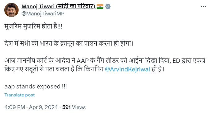 भाजपा सांसद मनोज तिवारी ने ट्वीट किया, “मुजरिम मुजरिम होता है। देश में हर किसी को भारत के कानून का पालन करना होगा। आज माननीय न्यायालय के आदेश ने AAP के गैंग लीडर को आईना दिखा दिया है, ED द्वारा एकत्र किए गए सबूत बताते हैं कि सरगना अरविंद केजरीवाल हैं। AAP बेनकाब हो गई है।”