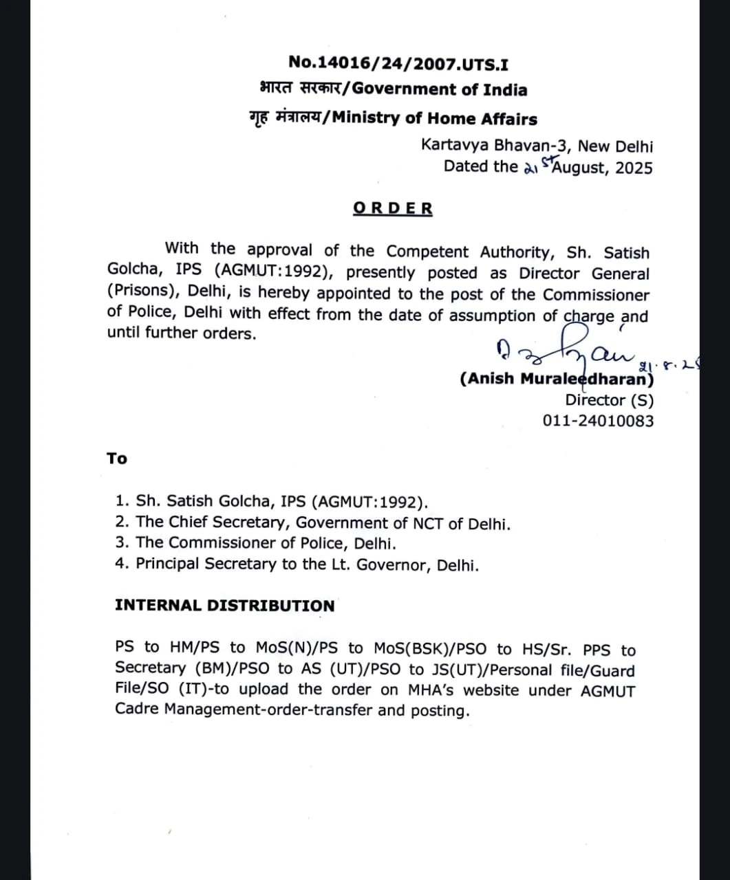 सक्षम प्राधिकारी के अनुमोदन के बाद वरिष्ठ आईपीएस अधिकारी सतीश गोलचा को दिल्ली का नया पुलिस कमिश्नर नियुक्त किया गया। वह वर्तमान में डीजी (जेल) दिल्ली के पद पर कार्यरत थे। उनकी नियुक्ति उस दिन से प्रभावी होगी, जिस दिन वह कार्यभार संभालेंगे और अगले आदेश तक जारी रहेगी।