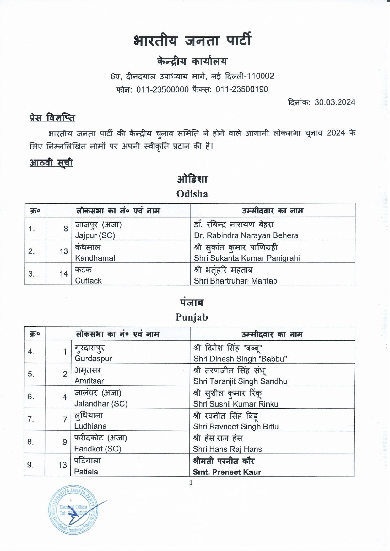 बीजेपी ने ३० मार्च को जिन 11 लोकसभा सीटों के लिए अपने उम्मीदवारों की घोषणा की, उसमें भर्तृहरि महताब, रवनीत सिंह बिट्टू, सुशील कुमार रिंकू और परनीत कौर जैसे कई नेताओं के नाम हैं। ये सभी हाल ही में अलग-अलग दलों से भाजपा में शामिल हुए थे। सभी को उन सीटों से ही चुनावी मैदान में उतारा गया है, जिनका वे मौजूदा लोकसभा में प्रतिनिधित्व करते हैं। अमेरिका में भारत के राजदूत रहे तरणजीत सिंह संधू को भी बीजेपी ने अमृतसर से मौका दिया है जबकि पटियाला से कैप्टन अमरिंदर सिंह की पत्नी तरणजीत कौर चुनाव लड़ेंगीं ।