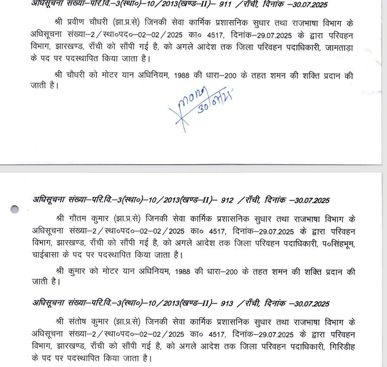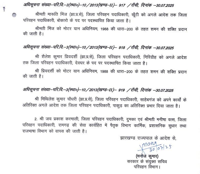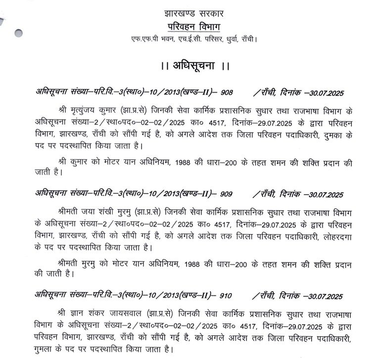 रांचीः झारखंड में बड़े पैमाने पर जिला परिवहन पदाधिकारियों का तबादला किया गया है। परिवहन विभाग ने डीटीओ के ट्रांसफर को लेकर अधिसूचना जारी कर दी है।