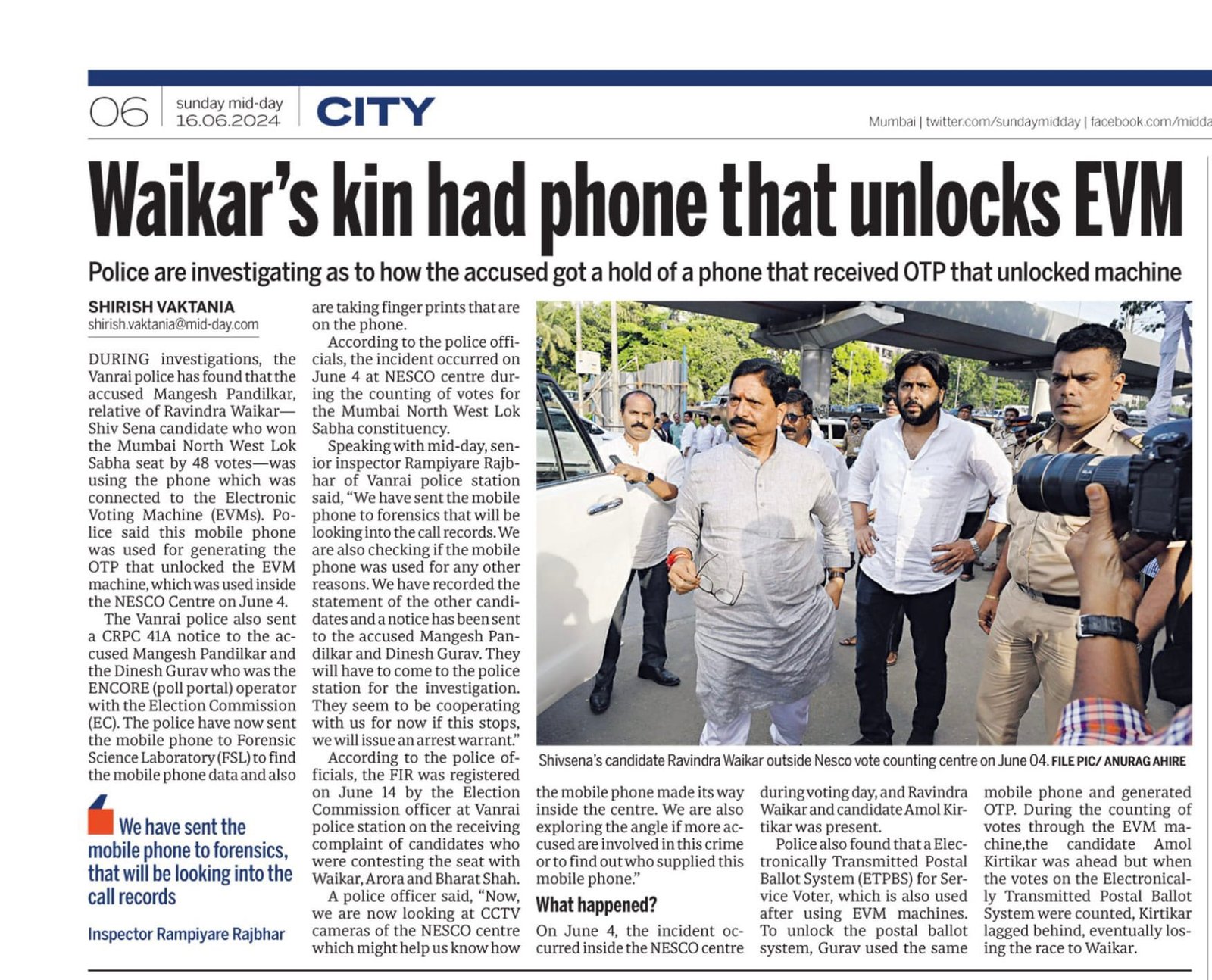 राहुल गांधी ने एक न्यूजपेपर की कटिंग को भी शेयर किया है। उसमें लिखा है कि 2024 के लोकसभा चुनाव में मात्र 48 वोटों से मुंबई उत्तर पश्चिम सीट जीतने वाले शिवसेना(शिंदे गुट) के सांसद रवींद्र वायकर के रिश्तेदार के फोन में ईवीएम मशीन खोलने की ट्रिक है। उनके रिश्तेदार मंगेश पांडिलकर पर आरोप है कि उन्होंने अपने मोबाइल फोन से ओटीपी जनरेट कर ईवीएम मशीन को अनलॉक करने की कोशिश की थी। वनराय पुलिस ने उन्हें सीआरपीसी की धारा 41A के तहत नोटिस भी दिया है।