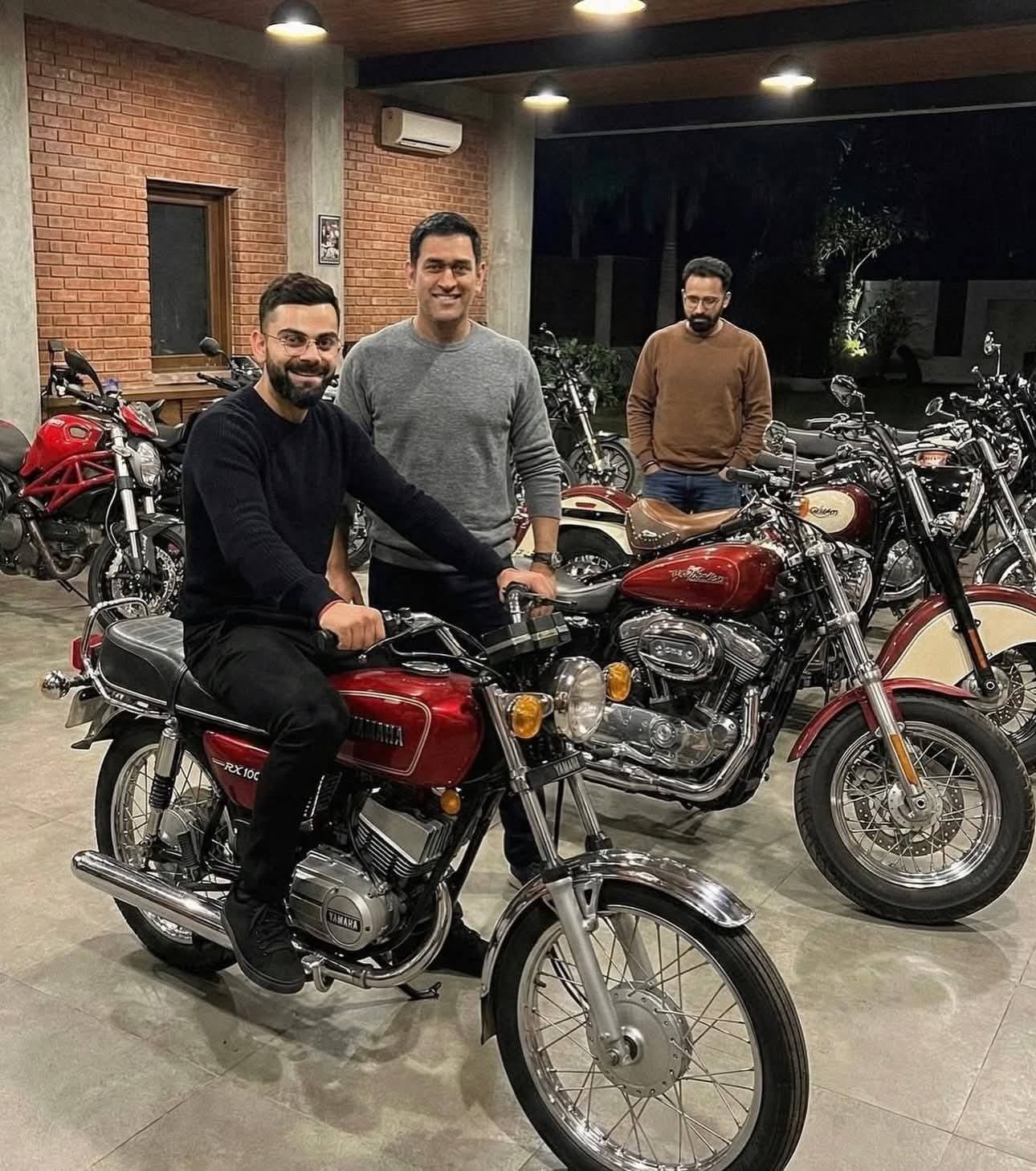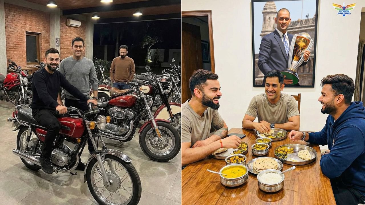 रांचीः सोशल मीडिया पर विराट कोहली और महेंद्र सिंह की धोनी की दो तस्वीरें खूब वायरल हो रही है। एक तस्वीर में विराट कोहली अपने पूर्व कप्तान के बाइक का कलेक्शन देख रहे है और तस्वीर खींचा रहे थे। पीछे एक शख्स खड़ा होकर चुपचाप इन चीजों को देख रहा है। दूसरी तस्वीर धोनी के घर डिनर पार्टी का बताया जा रहा है जिसमें धोनी और कोहली के साथ ऋषभ पंत मौजूद है। इसमें तीनों टेबल पर बैठक रोटी, दाल, सब्जी खाते और बात करते नजर आ रहे है।