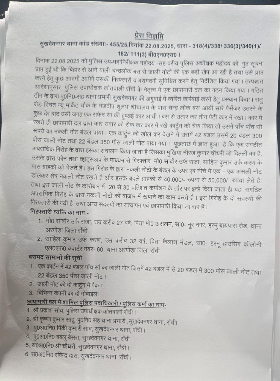 DIG सह रांची SSP चंदन कुमार सिन्हा के निर्देश पर डीएसपी प्रकाश सोए के नेतृत्व में पुलिस टीम ने सुखेदवनगर थाना क्षेत्र के न्यू मार्केट स्थित बस स्टैंड में खड़ी एक बस के अंदर रखे बंद बक्से से जाली नोट की इतनी बड़ी खेप बरामद की है।