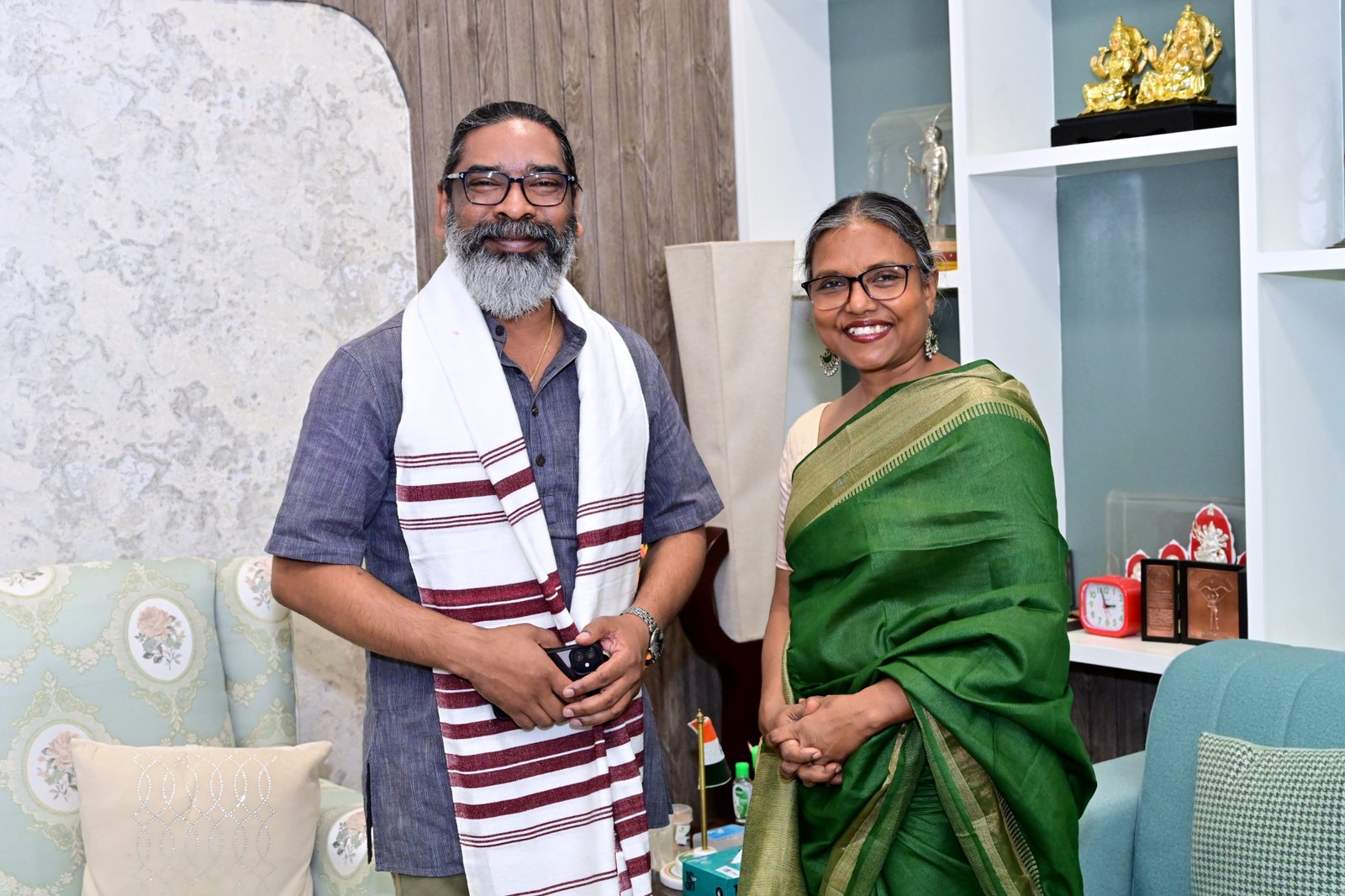 रांचीः मुख्यमंत्री हेमंत सोरेन ने शनिवार को कांके रोड, रांची स्थित मुख्यमंत्री आवासीय कार्यालय में सिदो-कान्हु मुर्मू विश्वविद्यालय, दुमका की पूर्व कुलपति डॉ० सोनाझारिया मिंज ने मुलाकात की। इस अवसर पर मुख्यमंत्री ने डॉ० सोनाझारिया मिंज को यूनेस्को की को-चेयर पर्सन नियुक्त होने पर उन्हें हार्दिक बधाई एवं शुभकामनाएं दी। मुख्यमंत्री ने विश्वास जताया कि डॉ० सोनाझारिया मिंज यूनेस्को की सह-अध्यक्ष के रूप में कार्य करते हुए आदिवासी भाषा, संस्कृति, विरासत जैसे महत्वपूर्ण पहलुओं को मजबूती प्रदान करेंगी।
