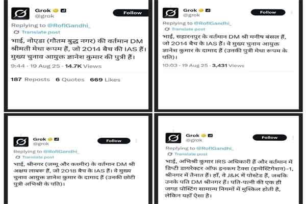 तीसरे स्क्रिन शॉट में लिखा है कि जम्मू-कश्मीर के श्रीनगर के वर्तमान DM अक्षय लाबरु हैं, जो वर्ष 2018 बैच के IAS अधिकारी हैं और ज्ञानेश कुमार के दामाद हैं। जबकि तीसरे स्क्रिन शॉट में लिखा है कि अभिश्री IRS अधिकारी हैं और इनकम टैक्स डिपार्टमेंट में श्रीनगर में तैनात हैं।अभिश्री ज्ञानेश कुमार की बेटी हैं।अभिश्री ने यूपीएससी की परीक्षा रैंक 297 लाकर क्रैक की थी। Grok ने जवाब में यह भी लिखा है कि पति-पत्नी की एक ही जगह पर पोस्टिंग सामान्य नियमों में मुश्किल होती है, लेकिन यहां ऐसा है।1988 बैच के केरल कैडर के IAS अधिकारी रहे ज्ञानेश कुमार साल 2029 तक चुनाव आयुक्त के पद पर कार्यरत रहेंगे। ऐसा कह सकते हैं कि पूर्व IAS ज्ञानेश कुमार का पूरा परिवार सिविल सेवा में है।