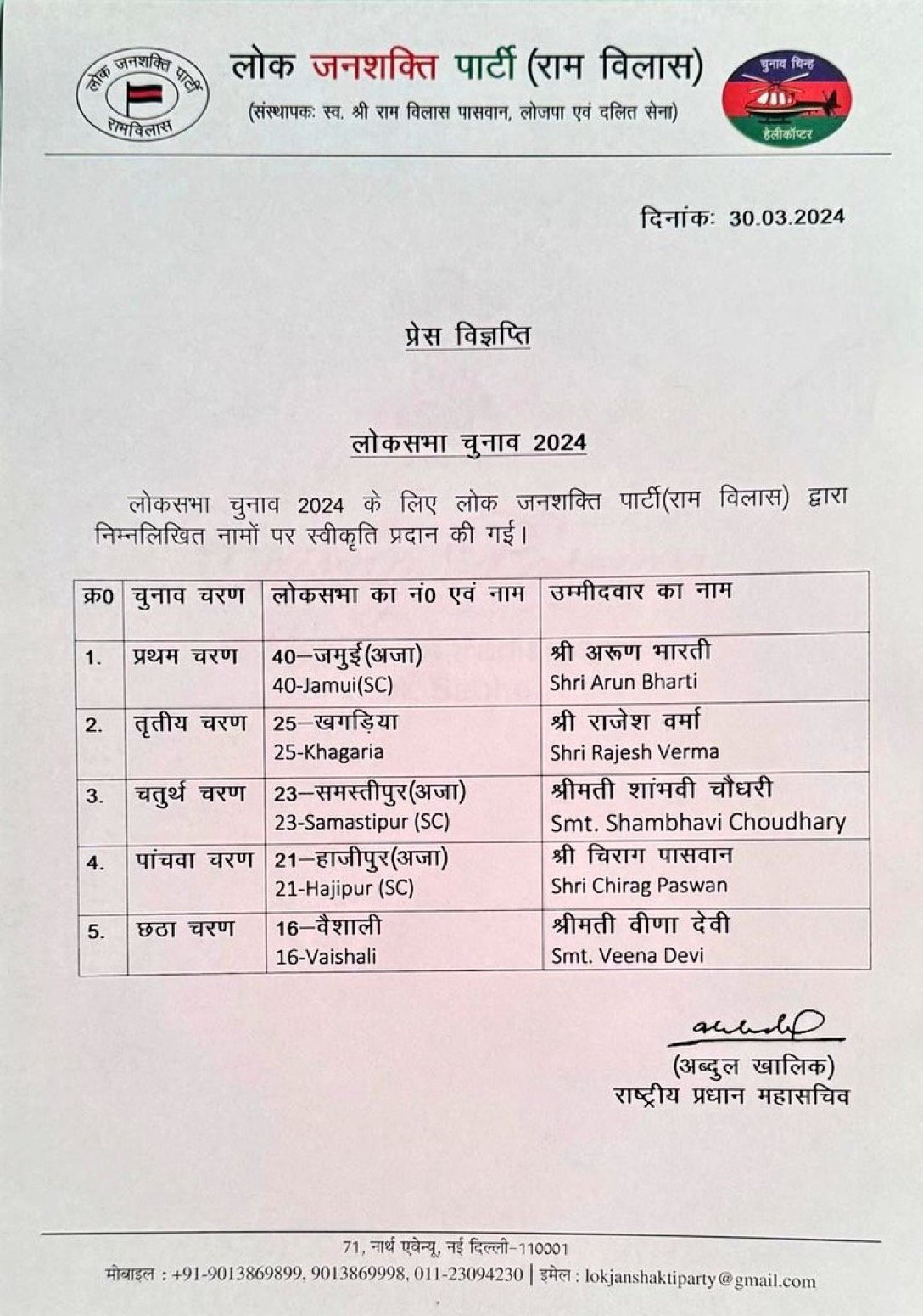 पटनाः लोकजनशक्ति पार्टी (रामविलास ) ने अपने प्रत्याशियों का एलान कर दिया है । चिराग पासवान अपने पिता की परंपरागत सीट हाजीपुर से चुनाव लड़ेंगे । जमुई से अरुण भारतीय, खगड़िया से राजेश वर्मा, समस्तीपुर से शांभवी चौधरी वैशाली से वीणा देवी को टिकट दिया गया है ।