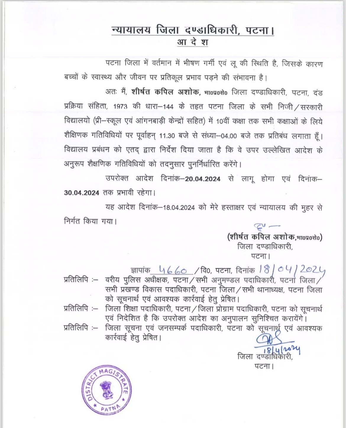 पटना सहित बिहार के लगभग सभी जिलों में पारा 40 के पास जा चुका है। राजधानी पटना में अधिकतम तापमान 40 से 42 डिग्री के बीच रह रही है। मगध इलाके में पड़ रही भीषण गर्मी की वजह से पटना डीएम ने ये आदेश जारी किया है।