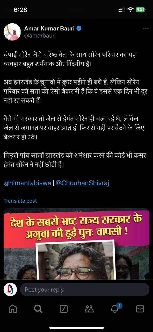 नेता विपक्ष अमर बाउरी ने अपने सोशल मीडिया अकाउंट पर पोस्ट करते हुए लिखा कि चंपाई सोरेन जैसे वरिष्ठ नेता के साथ सोरेन परिवार का यह व्यवहार बहुत शर्मनाक और निंदनीय है।अब झारखंड के चुनावों में कुछ महीने ही बचे हैं, लेकिन सोरेन परिवार को सत्ता की ऐसी बेकरारी है कि वे इससे एक दिन भी दूर नहीं रह सकते हैं। वैसे भी सरकार तो जेल से हेमंत सोरेन ही चला रहे थे, लेकिन जेल से जमानत पर बाहर आते ही फिर से गद्दी पर बैठने के लिए बेकरार हो उठे। पिछ्ले पांच सालों झारखंड को शर्मशार करने की कोई भी कसर हेमंत सोरेन ने नहीं छोड़ी है।