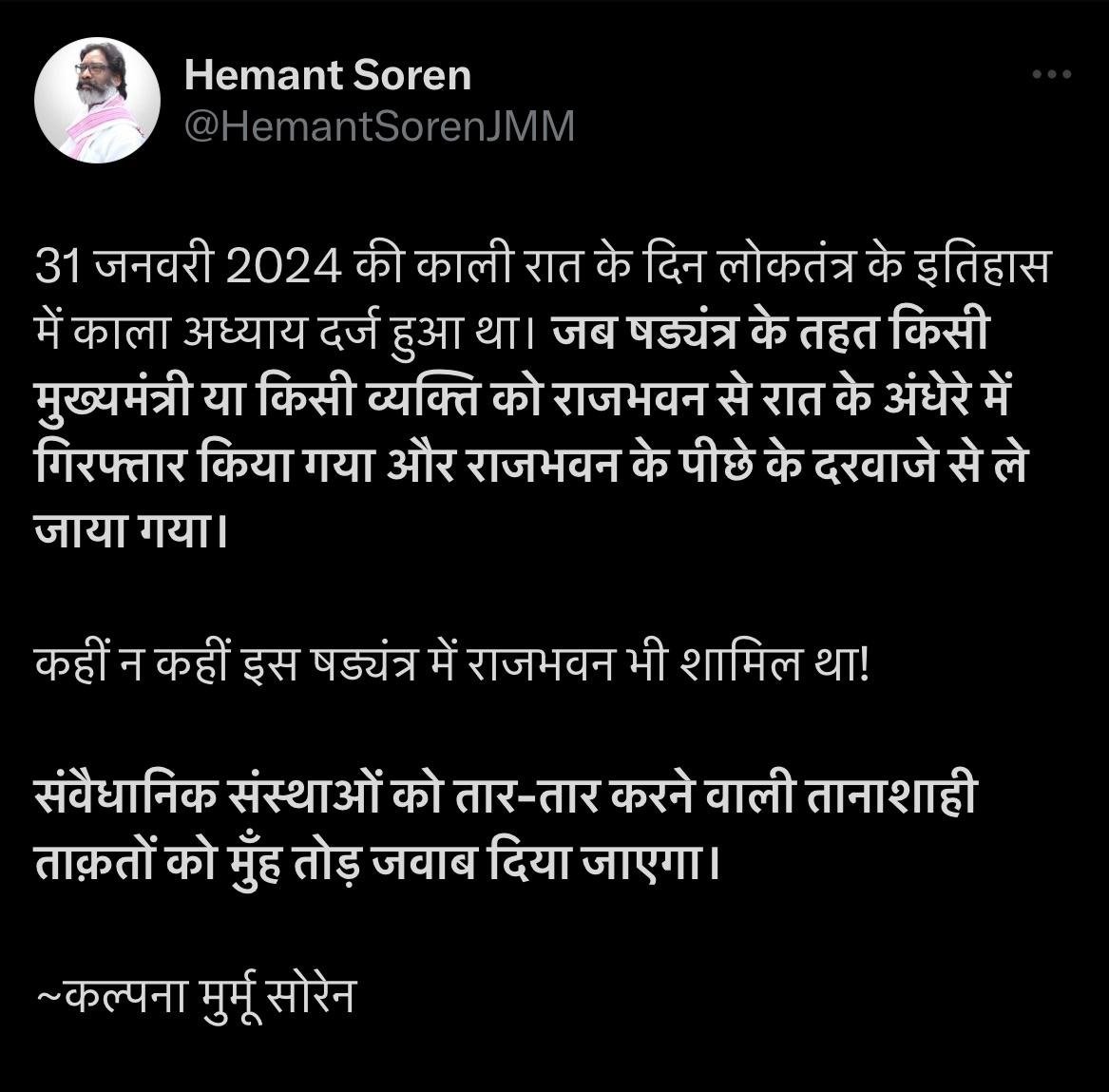 कल्पना सोरेन ने इंटरव्यू में हेमंत सोरेन की गिरफ्तारी की रात जो कुछ हुआ उसे बताते हुए कहा कि 31 जनवरी को ईडी के अफसर हमारे सरकारी आवास आये थे, शाम को पता चला कि वो हेमंत जी को अरेस्ट करने वाले है तो बहुत झटका लगा। उस समय घर में बहुत सारे लोग थे, सरकार में शामिल मंत्री और विधायक मौजूद थे। हम लोगों को थोड़ी देर के लिए समझ नहीं आता है कि अब हमलोगों को क्या करना है। इसके बाद हेमंत जी निर्णय लेते है कि वो इस्तीफा देंगे, इसके बाद वो राजभवन समर्थन पत्र देने हेमंत जी के साथ चार या पांच लोग जाते है। राजभवन जाकर ही उन्होने अपना इस्तीफा दिया। मुझे पूरा यकीन था कि इस्तीफा देने के बाद हेमंत जी घर आएंगे और ईडी के अधिकारी घर से उन्हे लेकर जाएंगे। इसके बाद खबर आती है कि हेमंत जी को राजभवन से लेकर ईडी के लोग चले गए। मुझे शुरू में पहला झटका उसी समय लगा जब ये पता चला कि ये अरेस्ट होने वाले है, दूसरा झटका ये लगा कि उन्हे ईडी राजभवन से ही लेकर चली गई। जानकारी ये मिली कि गिरफ्तार को किया उन्हे राजभवन से लेकिन पीछे के गेट से लेकर निकल गई, ये देखकर मुझे बहुत दुख लगा कि राजभवन के मुख्य गेट में सारे मीडिया और अन्य भी लोग खड़े थे, हमारे पार्टी और गठबंधन के विधायक भी मेन गेट पर ही थे। ऐसी कौन सी मजबूरी हो गई थी कि राजभवन के पीछे की गेट से चोर की तरह हेमंत जी को लेकर गई। मुझे ये बहुत खराब लगा। मुझे ये लगा था कि हेमंत जी घर आएंगे और यहां से ईडी उन्हे लेकर जाएगी। हेमंत जी ने राजभवन जाते समय कहा था कि मै आ रहा हूं, मै राजभवन जा रहा वहां से आकर घर आउंगा फिर ईडी के अधिकारियों के साथ जाउंगा।