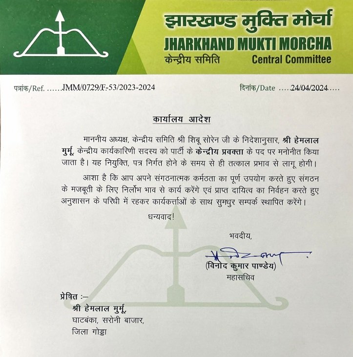 Home | Hemlal Murmu को जेएमएम ने बनाया केंद्रीय प्रवक्ता, जारी की गई अधिसूचना