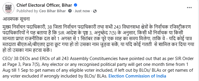 भारत निर्वाचन आयोग ने साफ किया कि एसआईआर आदेश के पृष्ठ 3 पर पैरा 7(5) के अनुसार किसी भी मतदाता या किसी भी मान्यता प्राप्त राजनीतिक दल को 1 अगस्त से 1 सितंबर तक एक महीने का समय मिलेगा, ताकि वे किसी भी पात्र मतदाता का नाम वोटर लिस्ट में शामिल करवा सकें, यदि उनके नाम बीएलओ/बीएलए द्वारा छोड़ दिया गया हो या गलत तरीके से बीएलओ/बीएलए द्वारा नाम शामिल किया गया हो।