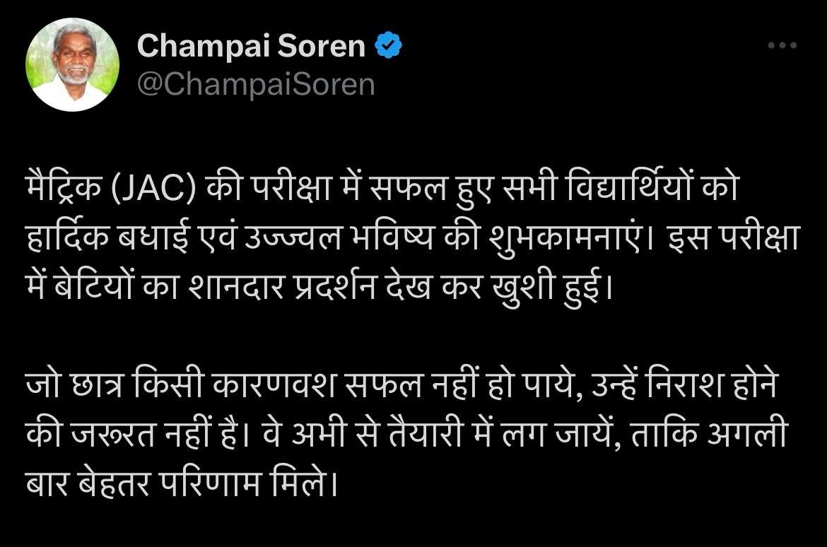 बोर्ड परीक्षा में सफल छात्रों को मुख्यमंत्री ने बधाई देते हुए अपने सोशल मीडिया अकाउंट एक्स पर लिखा है कि बोर्ड परीक्षा में सफल छात्रों को मुख्यमंत्री ने बधाई देते हुए अपने सोशल मीडिया अकाउंट एक्स पर लिखा है कि मैट्रिक (JAC) की परीक्षा में सफल हुए सभी विद्यार्थियों को हार्दिक बधाई एवं उज्ज्वल भविष्य की शुभकामनाएं। इस परीक्षा में बेटियों का शानदार प्रदर्शन देख कर खुशी हुई।
