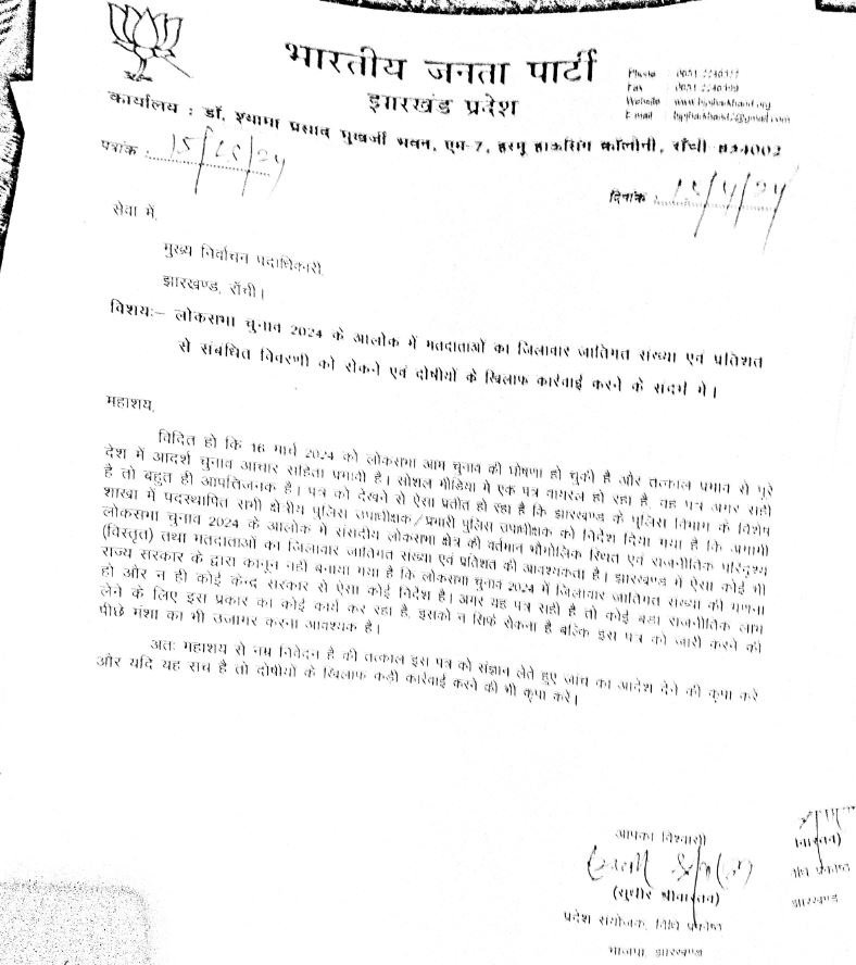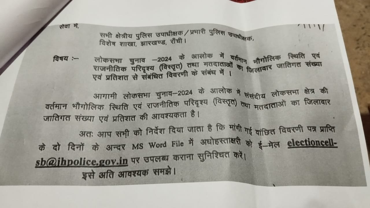 रांची: झारखंड पुलिस के स्पेशल ब्रांच द्वारा जारी किये गए एक चिट्ठी को लेकर सियासी बवाल खड़ा हो गया है। तीन अप्रैल को स्पेशल ब्रांच ने सभी जिलों के विशेष शाखा में तैनात डीएसपी को लोकसभा चुनाव को लेकर पत्र लिखा, इसमें संसदीय क्षेत्र के भौगोलिक स्थिति, राजनीतिक परिदृश्य और वोटरों का जिलावार जातिगत संख्या और प्रतिशत की जानकारी मांगी गई। उन्हे जल्द से जल्द रिपोर्ट देने का आदेश दिया गया।