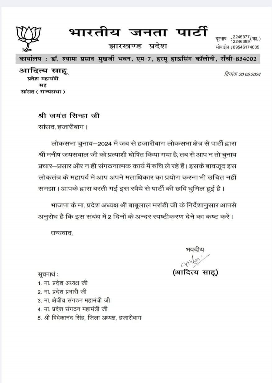 बीजेपी के प्रदेश महामंत्री आदित्य साहू ने पत्र लिखकर जयंत सिन्हा से जवाब मांगा है। जयंत सिन्हा को लिखे पत्र में बीजेपी की ओर से कहा गया है कि हजारीबाग लोकसभा क्षेत्र से मनीष जायसवाल को जब से उम्मीदवार बनाया गया तक से आप न तो चुनाव प्रचार और न ही संगठनात्मक कार्य में रूचि ले रहे है। लोकतंत्र के पर्व में आपने मताधिकार का प्रयोग करना भी उचित नहीं समझा। आपके द्वारा बरती गई इस रवैये से पार्टी की छवि धूमिल हुई है।प्रदेश अध्यक्ष बाबूलाल मरांडी के निर्देश पर उन्हे नोटिस जारी किया गया है, अगले दो दिनों में उनसे इस बारे में जवाब मांगा गया है।