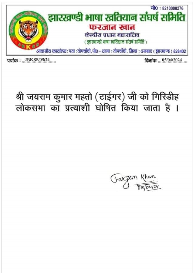 रांची : झारखंड भाषा खातियान संघर्ष समिति ने गिरिडीह लोकसभा सीट से जयराम महतो को उम्मीदवार बनाया है। शुक्रवार को झारखंड भाषा खातियान संघर्ष समिति के केंद्रीय प्रधान महासचिव फरजान खान ने उनकी उम्मीदवारी का एलान किया। जयराम महतो ने राज्य के 6 सीटों पर अपने उम्मीदवार उतारने का एलान किया था, शुक्रवार को गिरिडीह सीट पर उम्मीदवार की घोषणा कर दी गई।