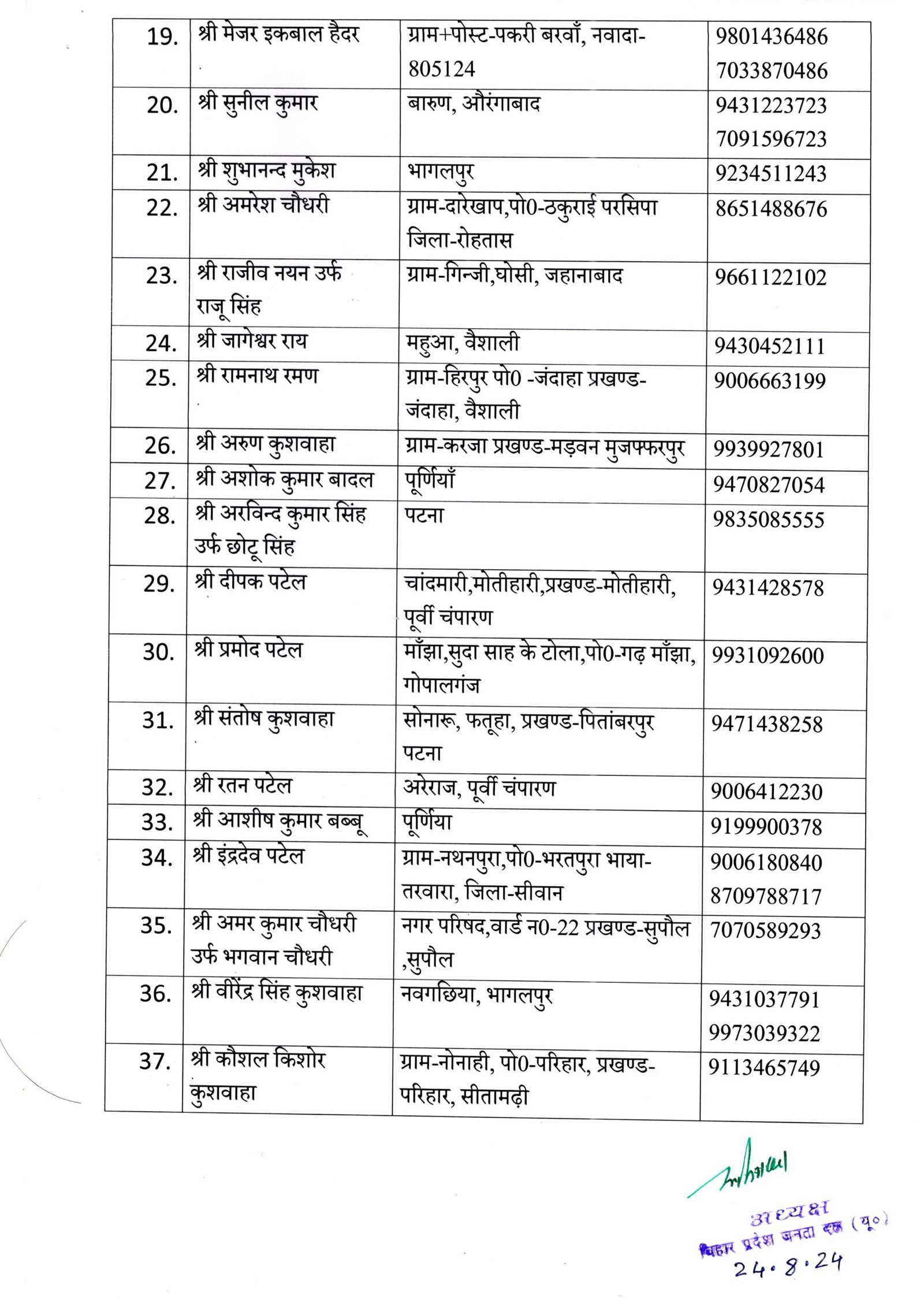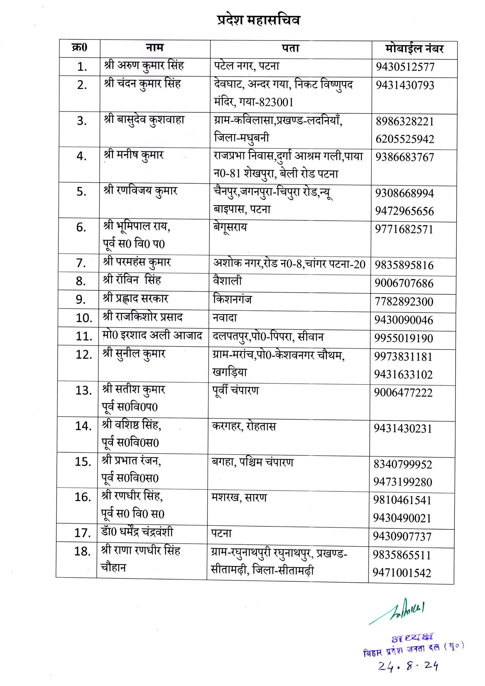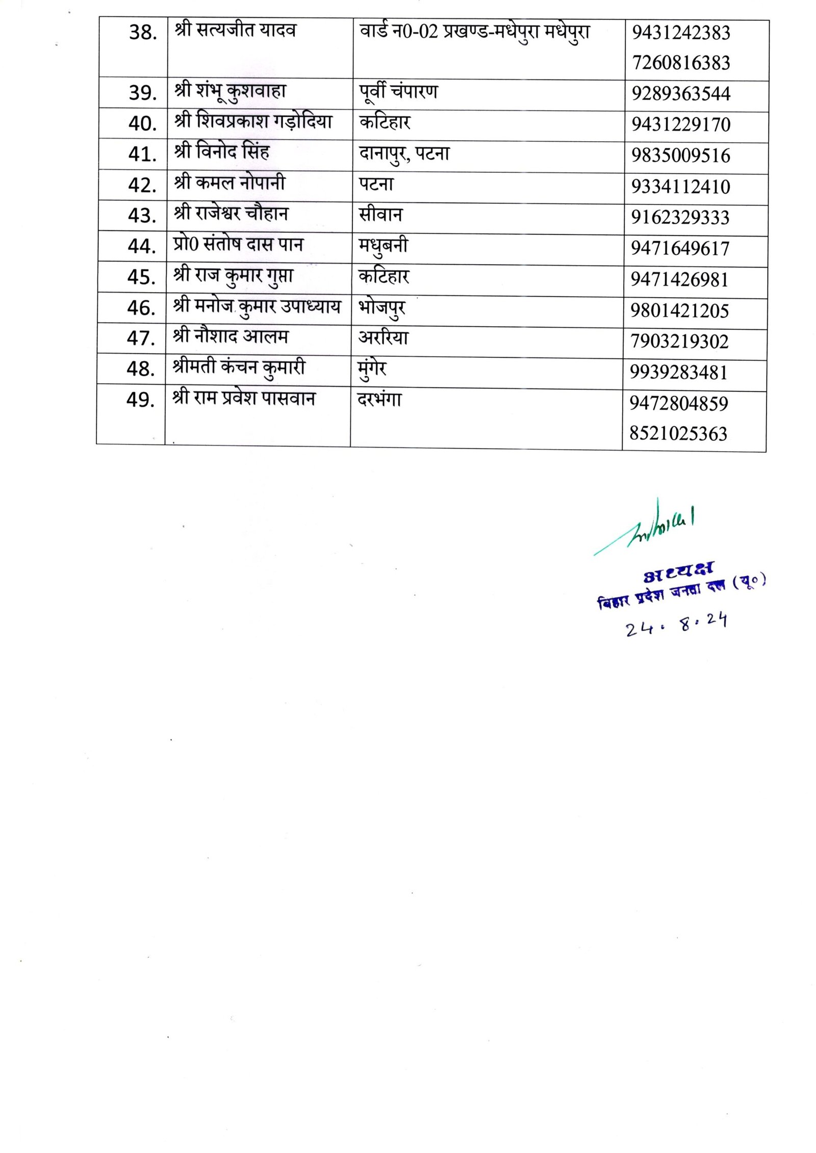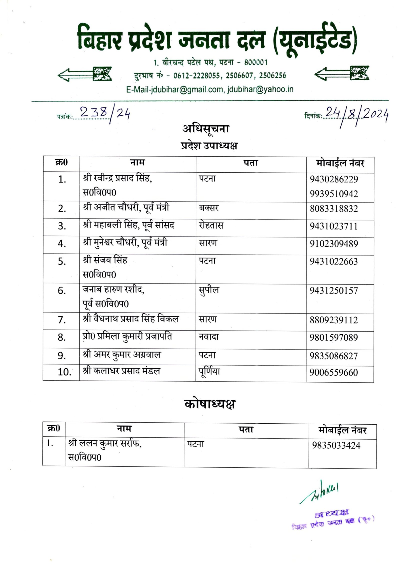 प्रदेश में विधानसभा चुनाव से एक साल पहले मुख्यमंत्री और राष्ट्रीय अध्यक्ष नीतीश कुमार और कार्यकारी अध्यक्ष संजय झा के परामर्श के बाद जंबो कमिटी का गठन किया गया है। इसमें 10 उपाध्यक्ष और 49 प्रदेश महासचिव को जगह दी गई है। ललन सर्राफ एक बार फिर से प्रदेश के कोषाध्यक्ष बनाये गए है।