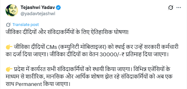 Reading: जीविका दीदीयों सरकारी कर्मचारी का मिलेगा दर्जा, तेजस्वी यादव का बड़ा चुनावी वायदा