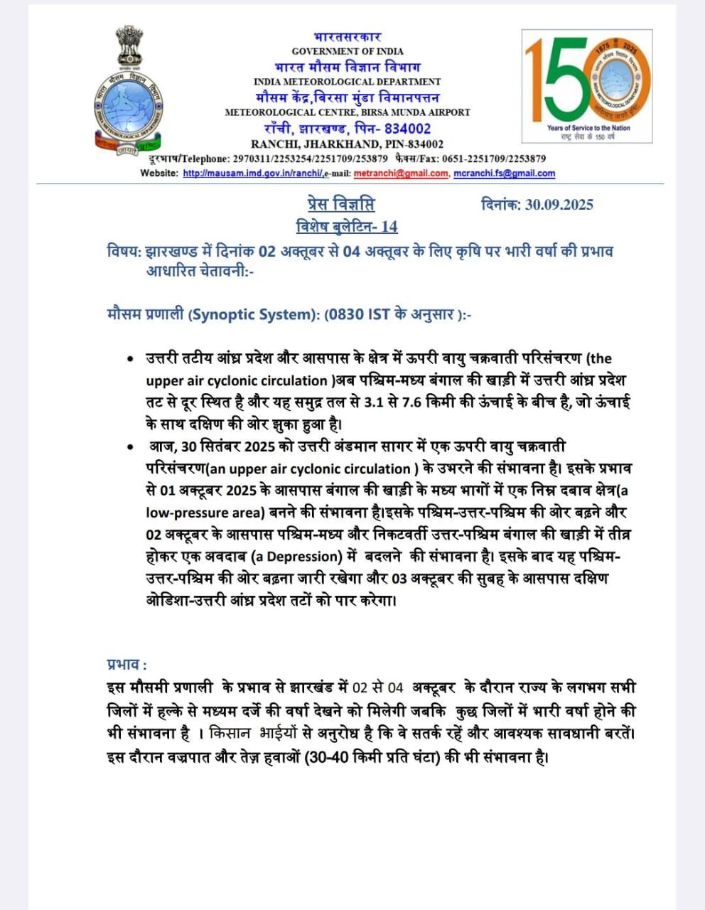 रुक-रुक कर बारिश होगी। खासकर धनबाद, गिरिडीह, गोड्डा, जामताड़ा, पाकुड़, साहिबगंज, देवघर और बोकारो में तेज हवाओं और वज्रपात के साथ भारी बारिश की संभावना है।