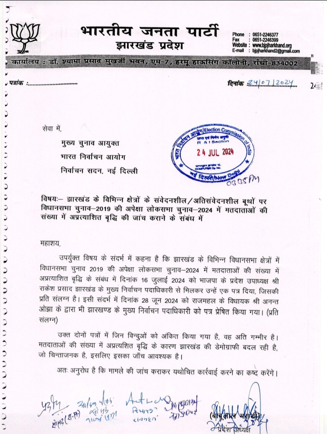 झारखंड के 10 विधानसभा क्षेत्रों में मुस्लिम वोटर बढ़ने को लेकर बाबूलाल ने की भारत निर्वाचन आयोग से शिकायत