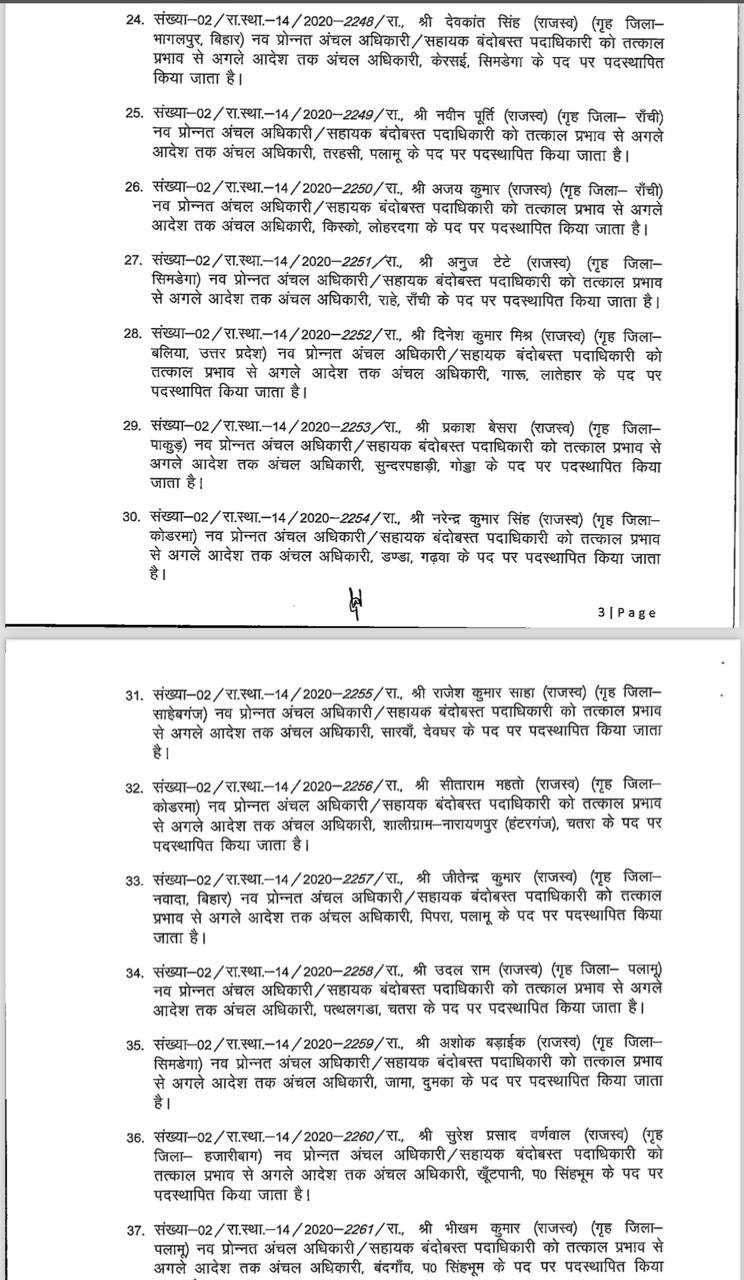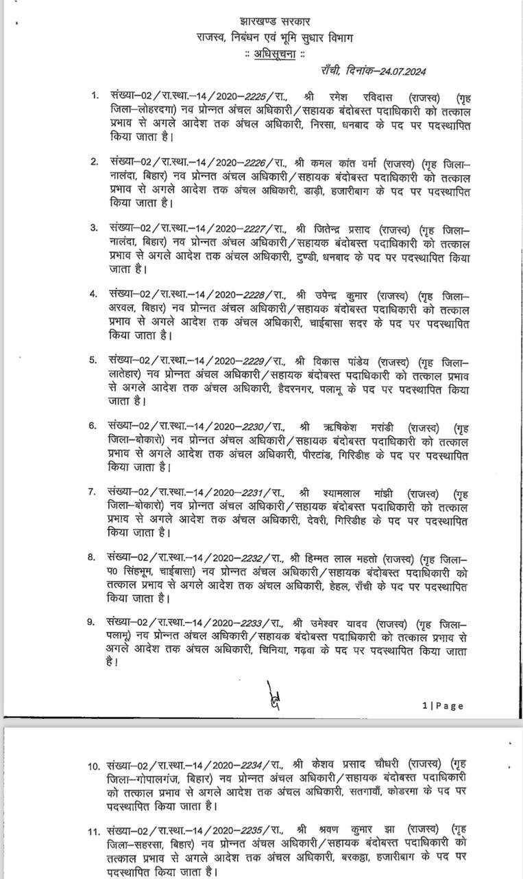 Home | Jharkhand में बड़े पैमाने पर अंचलाधिकारियों का तबादला, राजस्व निबंधन एवं भूमि सुधार विभाग ने जारी की अधिसूचनाJharkhand में बड़े पैमाने पर अंचलाधिकारियों का तबादला, राजस्व निबंधन एवं भूमि सुधार विभाग ने जारी की अधिसूचना July 24, 2024 10:19 PM By LiveDainik Desk 2 years ago Share SHARE रांची: झारखंड में बड़े पैमाने पर अंचलाधिकारियों का तबादला किया गया है। राज्य के 78 अंचलाधिकारी का ट्रांसफर किया गया है। राजस्व निबंधन एवं भूमि सुधार विभाग ने इसको लेकर अधिसूचना जारी कर दी है।देखिये पूरी लिस्ट WhatsApp Channel Join Now Telegram Group Join Now Instagram Group Join Now Share This Article Facebook Whatsapp Whatsapp Telegram Print Previous Article झारखंड कैबिनेट की बैठक में 30 एजेंडों पर लगी मुहर, मंत्री और अधिकारियों को मिलेंगे महंगे मोबाइल Next Article BJP IT Cell के अमित मालवीय पर RSS का हमला, रतन शारदा ने बजट पर ट्रोल करने पर बोली बहुत बड़ी बात Leave a Comment Leave a Comment Leave a Reply Cancel replyYour email address will not be published. Required fields are marked *Comment *Name * Email * Website Save my name, email, and website in this browser for the next time I comment. - Advertisement -Recent Posts नीतीश कुमार ने राज्यसभा के लिए भरा नामांकन, अमित शाह के साथ मांझी और ललन सिंह भी रहे मौजूद नीतीश कुमार ने राज्यसभा जाने का लिया फैसला, देंगे मुख्यमंत्री पद से इस्तीफा नीतीश युग का आज बिहार में होगा अंत, मुख्यमंत्री राज्यसभा के लिए करेंगे नामांकन नीतीश कुमार जाएंगे राज्यसभा! निशांत बनेंगे उपमुख्यमंत्री! बिहार में होली के बाद BJP की बनेगी सरकार? रांची में होली से पहले अपराधियों ने शराब दुकान में की फायरिंग, CCTV में कैद हुई वारदात धोनी के ब्लैक मर्सिडीज का कटा 1000 रुपये का चालान, रांची में ओवरस्पीडिंग में फंसे कैप्टन कूल PMCH के डॉक्टरों पर नशे में मरीज और उनके परिजनों से मारपीट का आरोप, मोबाइल और ट्रॉली बैग छीना, केस दर्ज होली के दिन पटना में बड़ा हादसा,कार वॉशिंग सेंटर में लगी भीषण आग