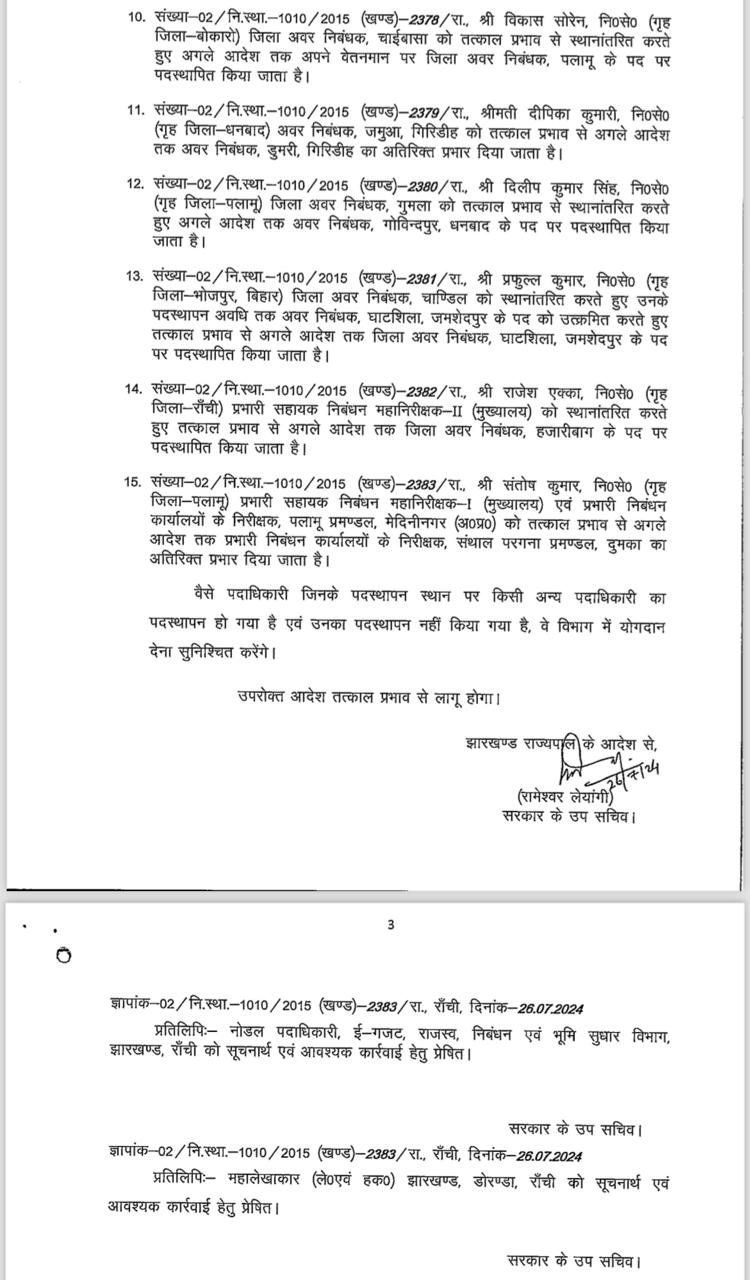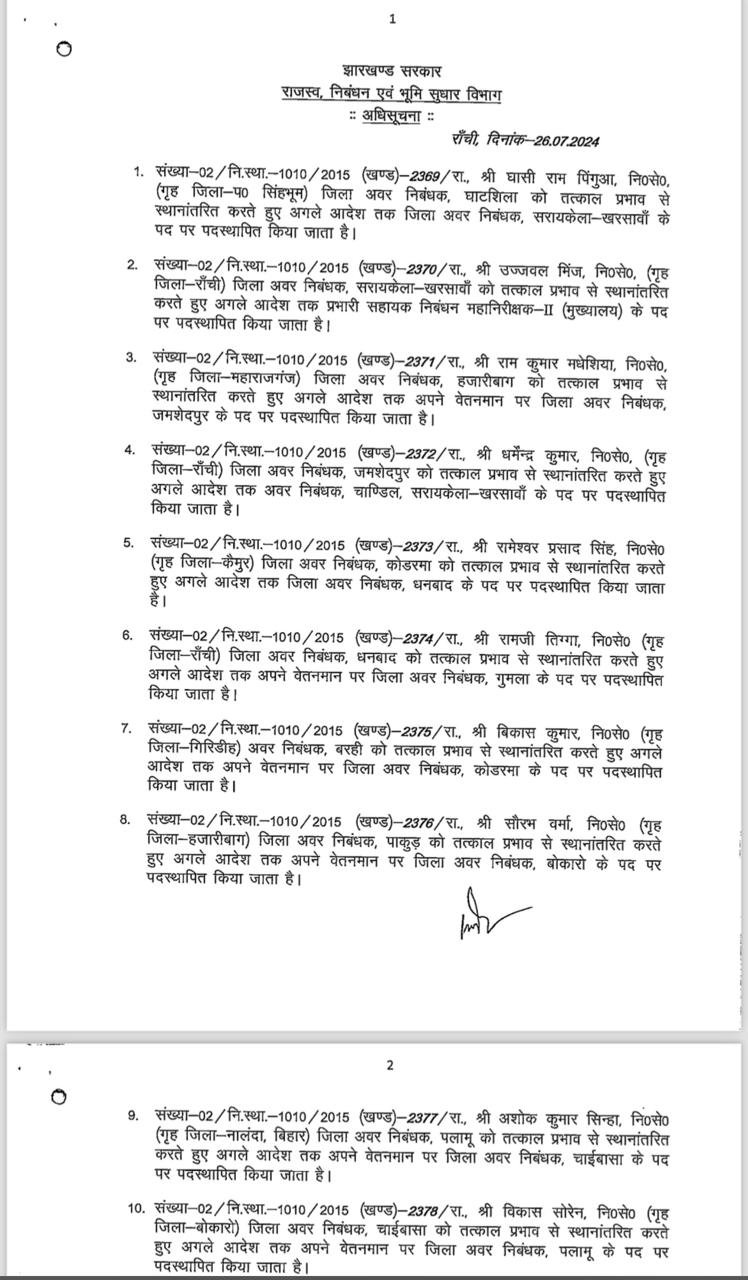 Reading: Jharkhand में बड़े पैमाने पर जिला अवर निबंधकों का तबादला, राजस्व, निबंधन एवं भूमि सुधार विभाग ने जारी की अधिसूचना