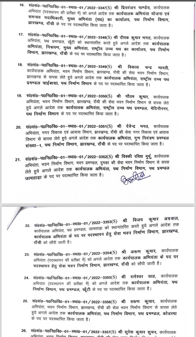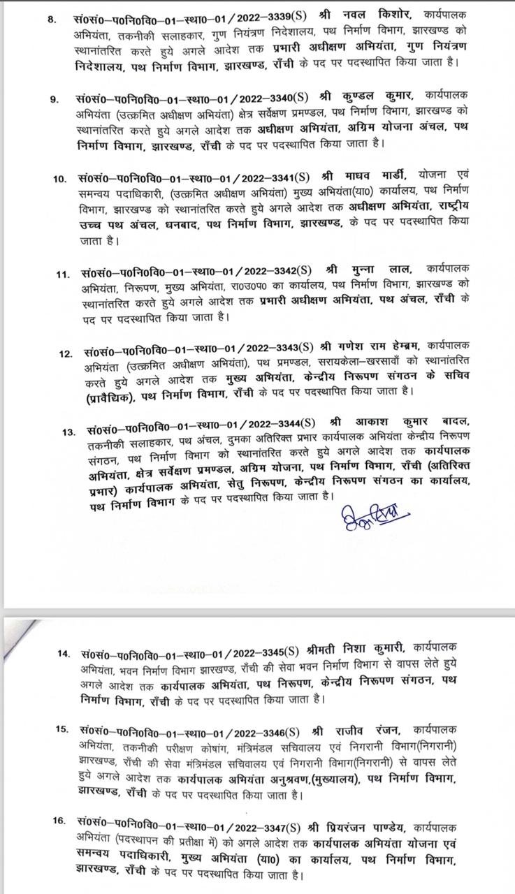 झारखंड में पथ निर्माण विभाग ने बड़े पैमाने पर तबादले, देखे पूरी लिस्ट