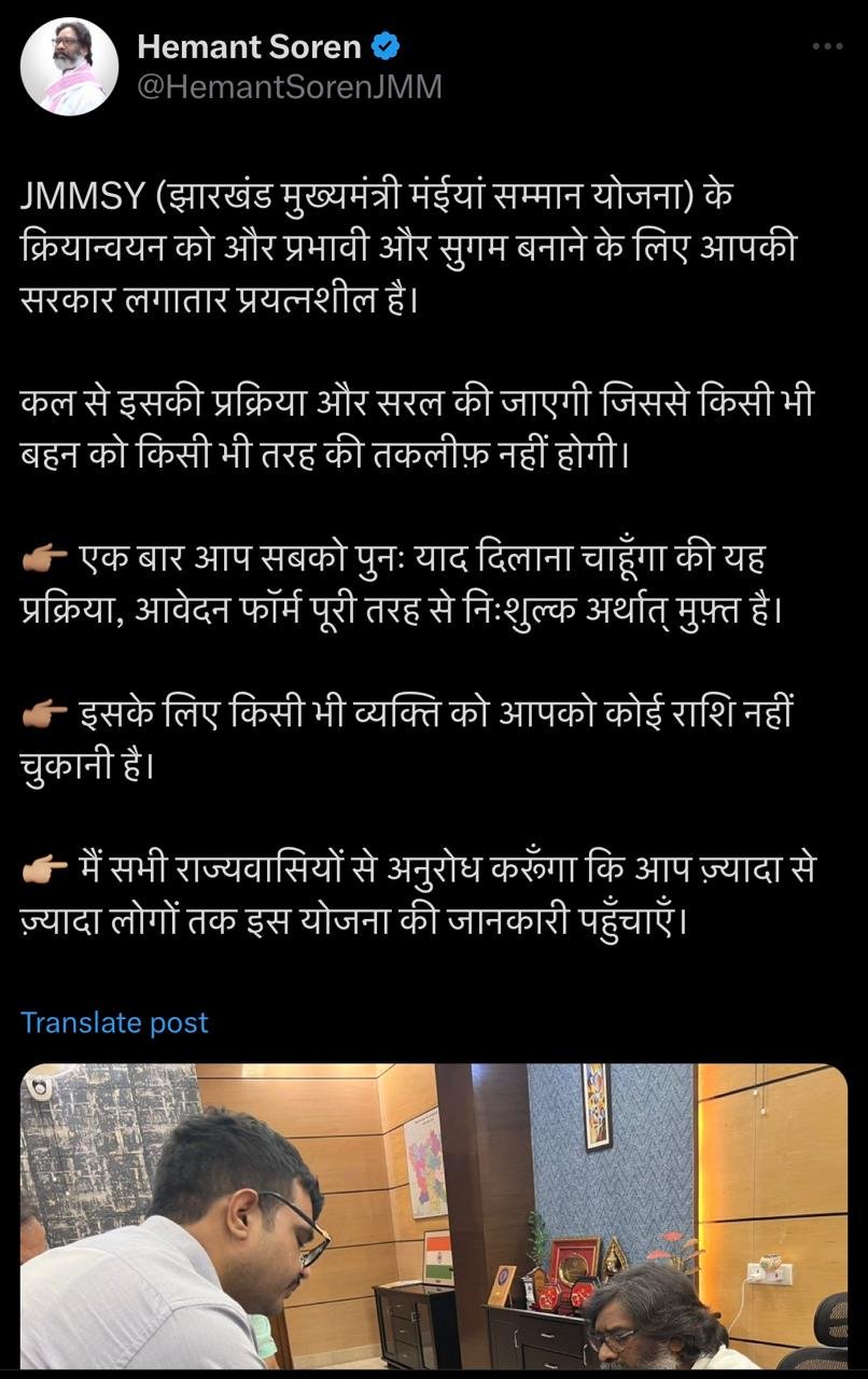 मुख्यमंत्री हेमंत सोरेन ने योजना के क्रियान्वयन में आ रही दिक्कतों का अध्ययन करने के बाद महिलाओं को भरोसा देते हुए अपने सोशल मीडिया अकाउंट पर पोस्ट किया कि JMMSY (झारखंड मुख्यमंत्री मंईयां सम्मान योजना) के क्रियान्वयन को और प्रभावी और सुगम बनाने के लिए आपकी सरकार लगातार प्रयत्नशील है।