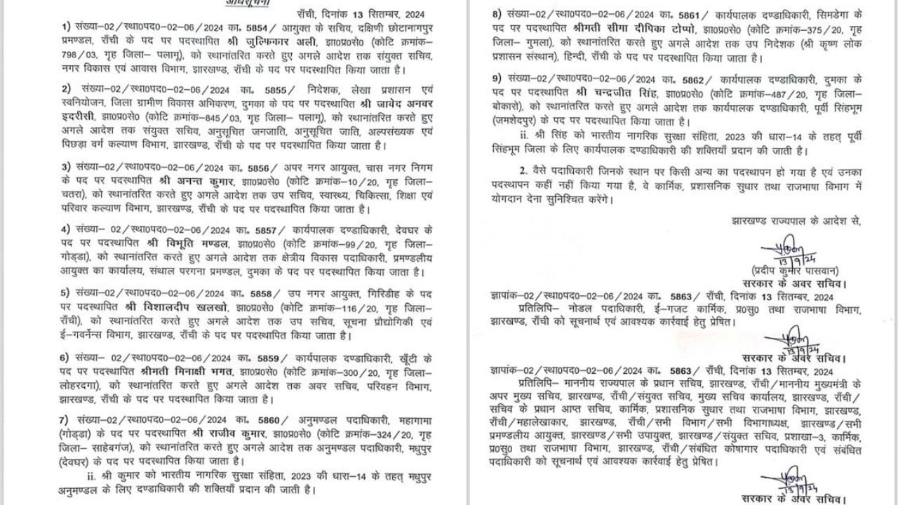 रांची: झारखंड में 9 अधिकारियों के तबादले किये गए है। झारखंड प्रशासनिक सेवा के अधिकारियों के तबादले को लेकर कार्मिक प्रशासनिक सुधार और राजभाषा विभाग ने अधिसूचना जारी की है।