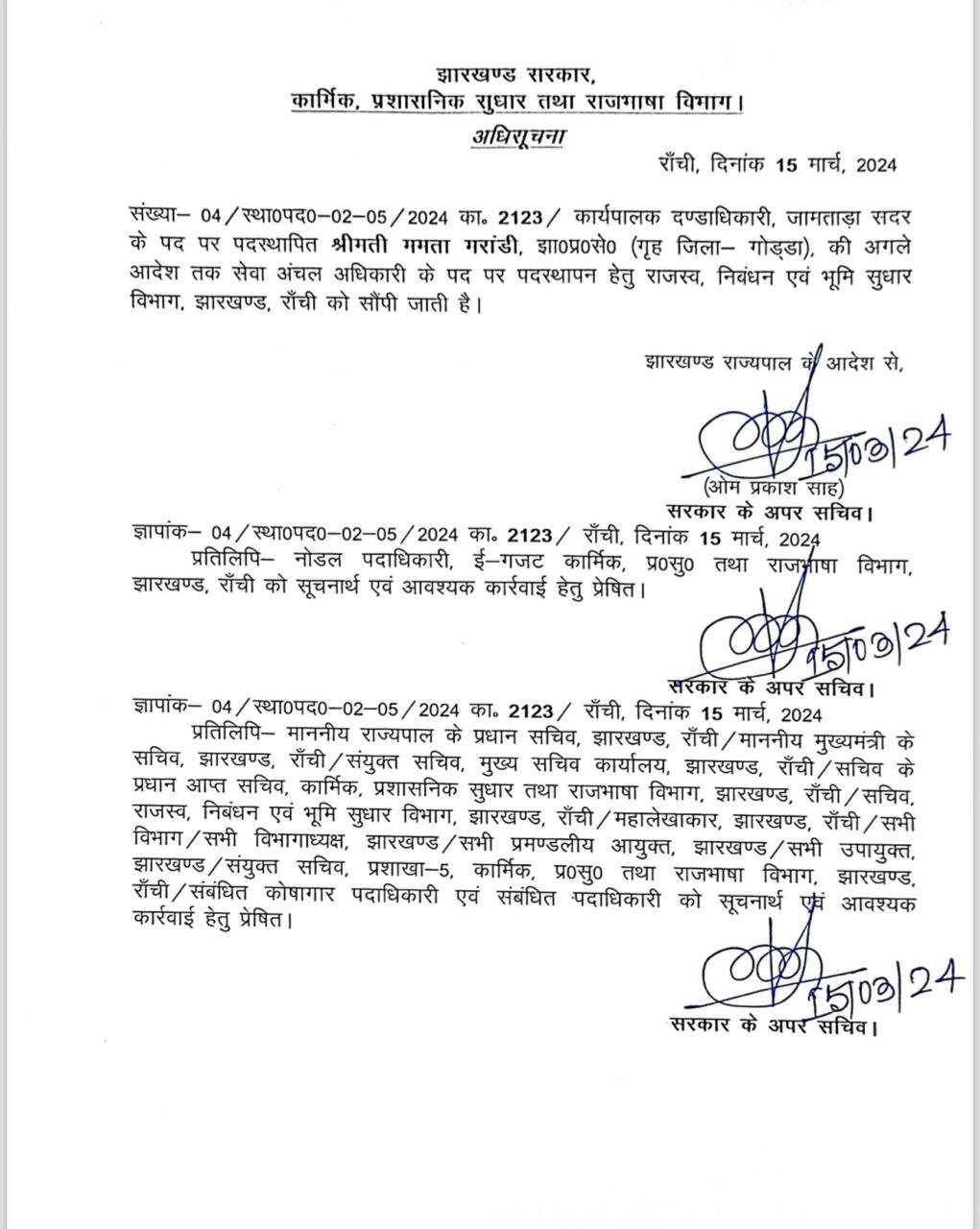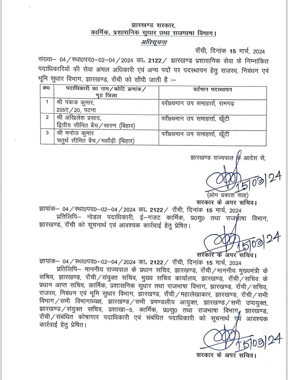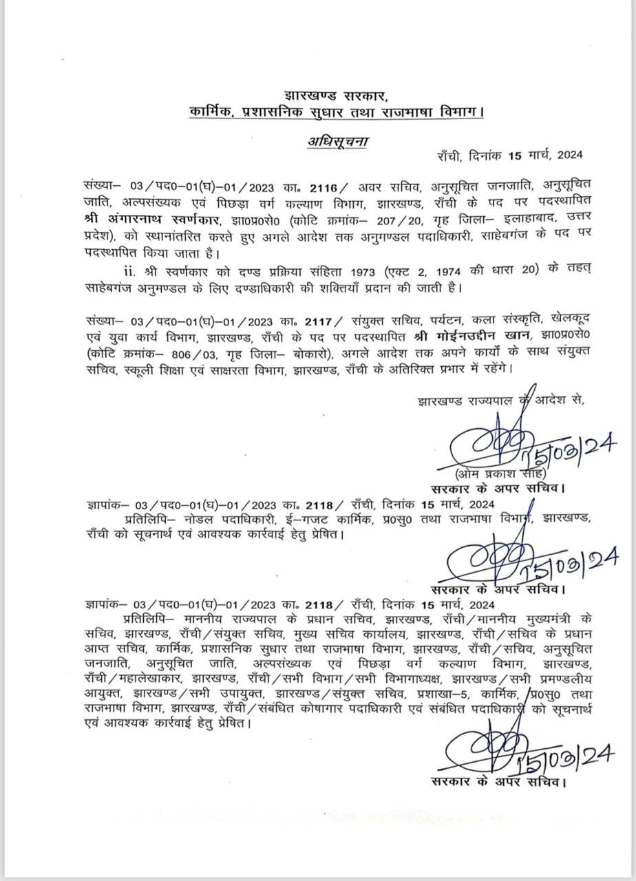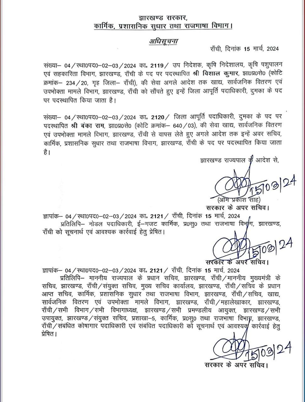 Home | झारखंड प्रशासनिक सेवा के कई अधिकारियों का तबादला, कार्मिक प्रशासनिक सुधार और राजभाषा विभाग ने जारी की अधिसूचनाझारखंड प्रशासनिक सेवा के कई अधिकारियों का तबादला, कार्मिक प्रशासनिक सुधार और राजभाषा विभाग ने जारी की अधिसूचना March 15, 2024 10:31 PM By LiveDainik Desk 2 years ago Share SHARE रांची : लोकसभा चुनाव की घोषणा से एक दिन पहले झारखंड प्रशासनिक सेवा के कई अधिकारियों का तबादला किया गया है। कार्मिक प्रशासनिक सुधार और राजभाषा विभाग ने इसको लेकर अधिसूचना जारी कर दी है।देखिये सूची- Advertisement - WhatsApp Channel Join Now Telegram Group Join Now Instagram Group Join Now Share This Article Facebook Whatsapp Whatsapp Telegram Print Previous Article पेपर लीक पर बिहार-झारखंड में सबसे बड़ी कार्रवाई,600 एडमिट कार्ड बरामद, बिहार के अधिकारी का वाहन जब्त, 12 लाख में हुई थी डील Next Article जेल में बंद हेमंत सोरेन हो रहे है कैदियों की समस्याओं से रूबरू, कल्पना सोरेन ने बताई पूर्व मुख्यमंत्री की चिंता Leave a Comment Leave a Comment Leave a Reply Cancel replyYour email address will not be published. Required fields are marked *Comment *Name * Email * Website Save my name, email, and website in this browser for the next time I comment. - Advertisement -Recent Posts बाबूलाल मरांडी को हाईकोर्ट से बड़ी राहत, हेमंत सोरेन पर आपत्तिजनक टिप्पणी मामले में सभी FIR किया रद्द पटना में कोतवाली थाने के सामने तेज रफ्तार कार ने 5 लोगों को कुचला, 3 की हालत गंभीर झारखंड विधानसभा के बजट सत्र को लेकर सर्वदलीय बैठक, सत्र के कार्यदिवस में फेरबदल, 21 को होगी 23 फरवरी की कार्यवाही बिहार में 50 हजार रिश्वत लेते जिला कृषि पदाधिकारी गिरफ्तार, विशेष निगरानी इकाई ने की कार्रवाई JMM सांसद महुआ माजी के बेटे सोमवित माजी के खिलाफ कार्रवाई की मांग, BJP के प्रतिनिधिमंडल ने की शिकायत रांची में मर्सिडीज ने बाइक को मारी टक्कर, बोनट पर युवक को घुमाने और मारपीट का आरोप लोहरदगा में भव्यता के साथ मनाया गया वीर बुधु भगत की जयंती, मंत्री दीपिका पांडे सिंह ने कहा बलिदानियों के जन्मस्थली को मिलेगी विशेष पहचान पाकिस्तानी हैंडलर को भागाने वाला अबुल इनाम उर्फ लादेन गिरफ्तार, मधुबनी में चला रहा था जाली नोटों का धंधा